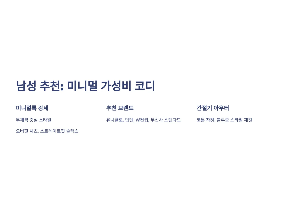남성복에서는 무채색 중심의 미니멀룩이 여전히 강세입니다. 특히, 화이트/그레이 계열의 오버핏 셔츠나 스트레이트핏 슬랙스는 데일리 아이템으로 강력 추천돼요. 유니클로나 탑텐 같은 SPA 브랜드 외에도, W컨셉, 무신사 스탠다드 등에서는 디자인과 품질을 모두 잡은 제품들이 다양하게 출시되고 있어요. 간절기 아우터로는 코튼 자켓이나 블루종 스타일 재킷이 부담 없는 가격에 많은 인기를 얻고 있으며, 깔끔한 셋업 코디도 포멀하면서 실용적인 스타일링으로 주목받고 있습니다.