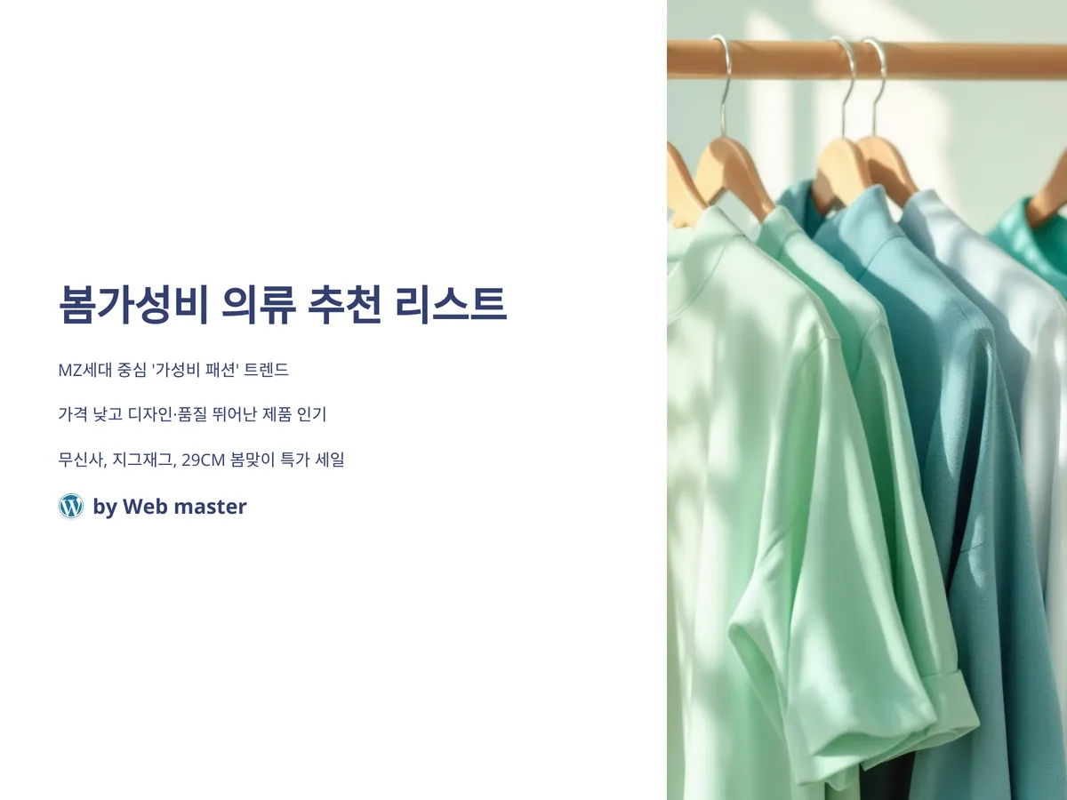 따뜻한 햇살이 퍼지는 봄, 옷장을 새로 채우고 싶지만 지출이 걱정된다면? 요즘 MZ세대를 중심으로 '가성비 패션'이 새로운 소비 트렌드로 떠오르고 있어요. 가격은 낮지만 디자인과 품질은 뛰어난 제품을 찾는 사람들이 늘어나면서, 봄 시즌에도 실속 있는 소비가 중심이 되고 있습니다. 특히 무신사, 지그재그, 29CM 같은 플랫폼에서는 봄맞이 특가 세일이 이어지며 수많은 브랜드가 경쟁하듯 합리적인 제품을 선보이고 있죠. 이런 흐름은 환경을 생각하는 가치소비와도 맞닿아 있으며, 시즌 트렌드인 '미니멀룩', '네추럴톤', '에코원단' 등의 스타일과도 맞물려 더욱 강세를 보이고 있습니다. 이번 포스팅에서는 2025년 봄을 위한 가성비 좋은 의류 브랜드와 제품을 완벽하게 정리해봤어요. 지금 가장 핫한 추천 리스트부터, 스타일링 팁까지 모두 담았으니 끝까지 읽고 실속 있는 쇼핑을 시작해보세요!