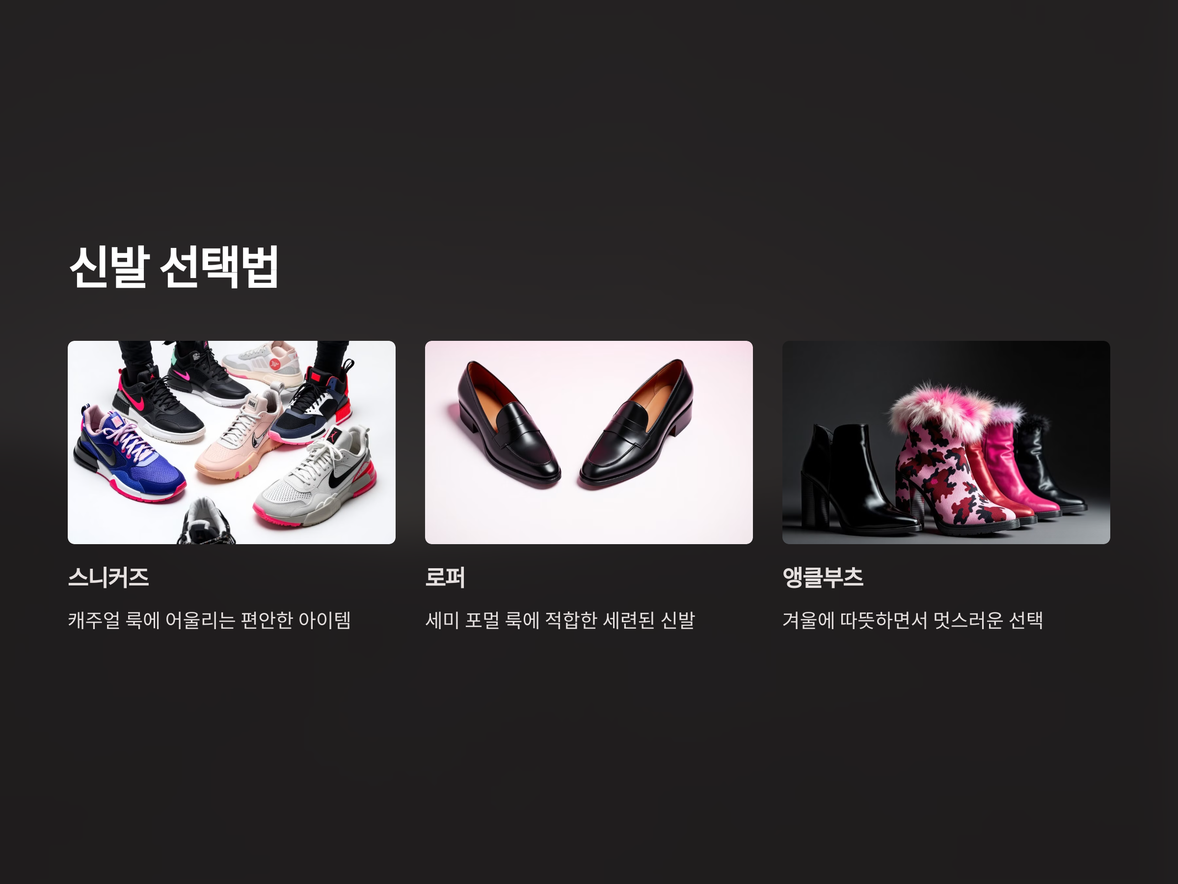 - 스니커즈: 캐주얼한 룩에 잘 어울리는 스니커즈는 편안하면서도 스타일리시한 아이템입니다. 다양한 디자인과 색상이 있으므로, 상황에 맞게 선택할 수 있습니다.