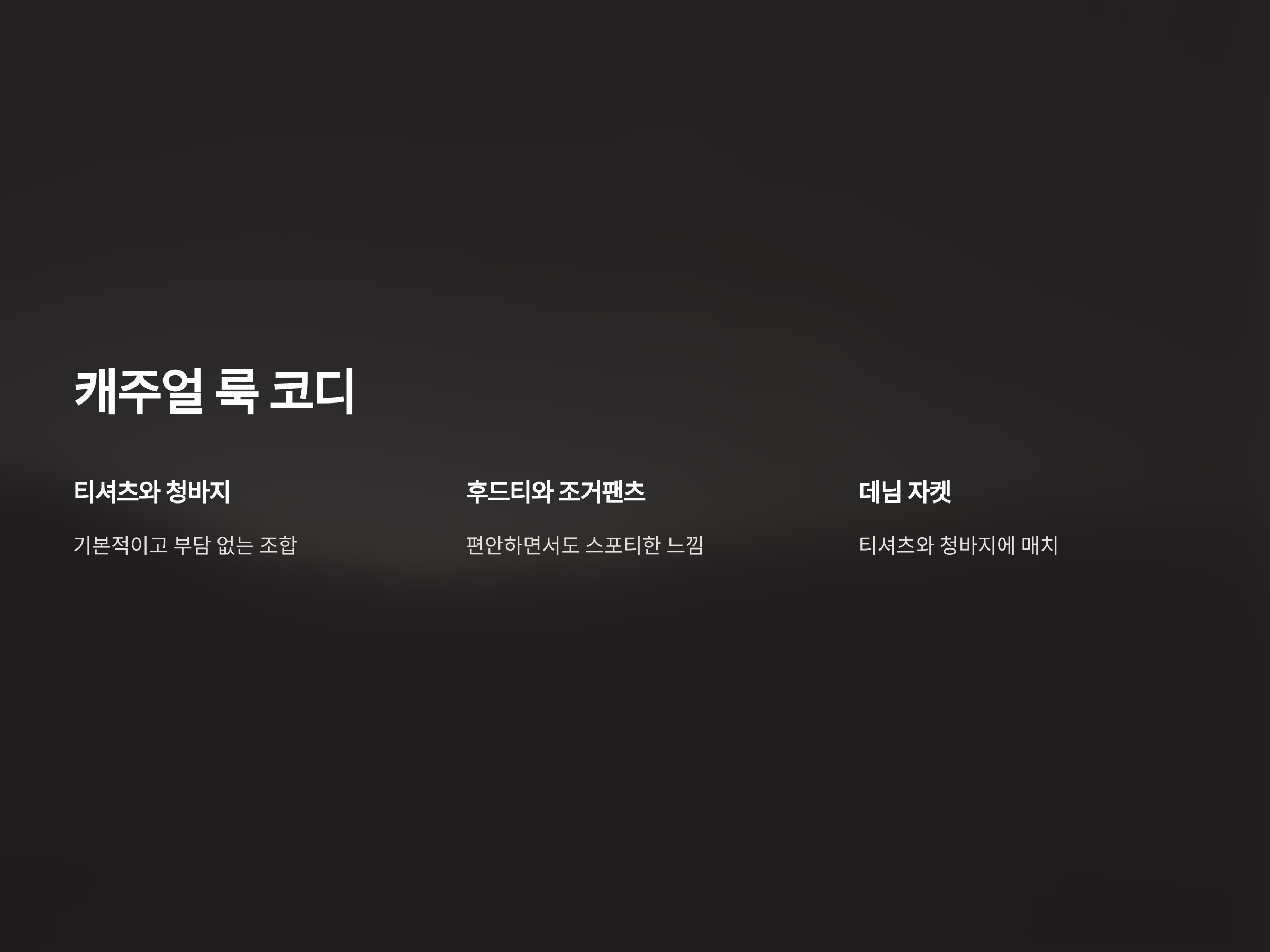 캐주얼한 외출을 원한다면 간편하면서도 멋스러운 스타일을 선택해야 합니다. 캐주얼 룩은 무난하면서도 편안하고 활동적인 느낌을 줄 수 있습니다. 중요한 것은 스타일과 편안함을 동시에 충족하는 것입니다.