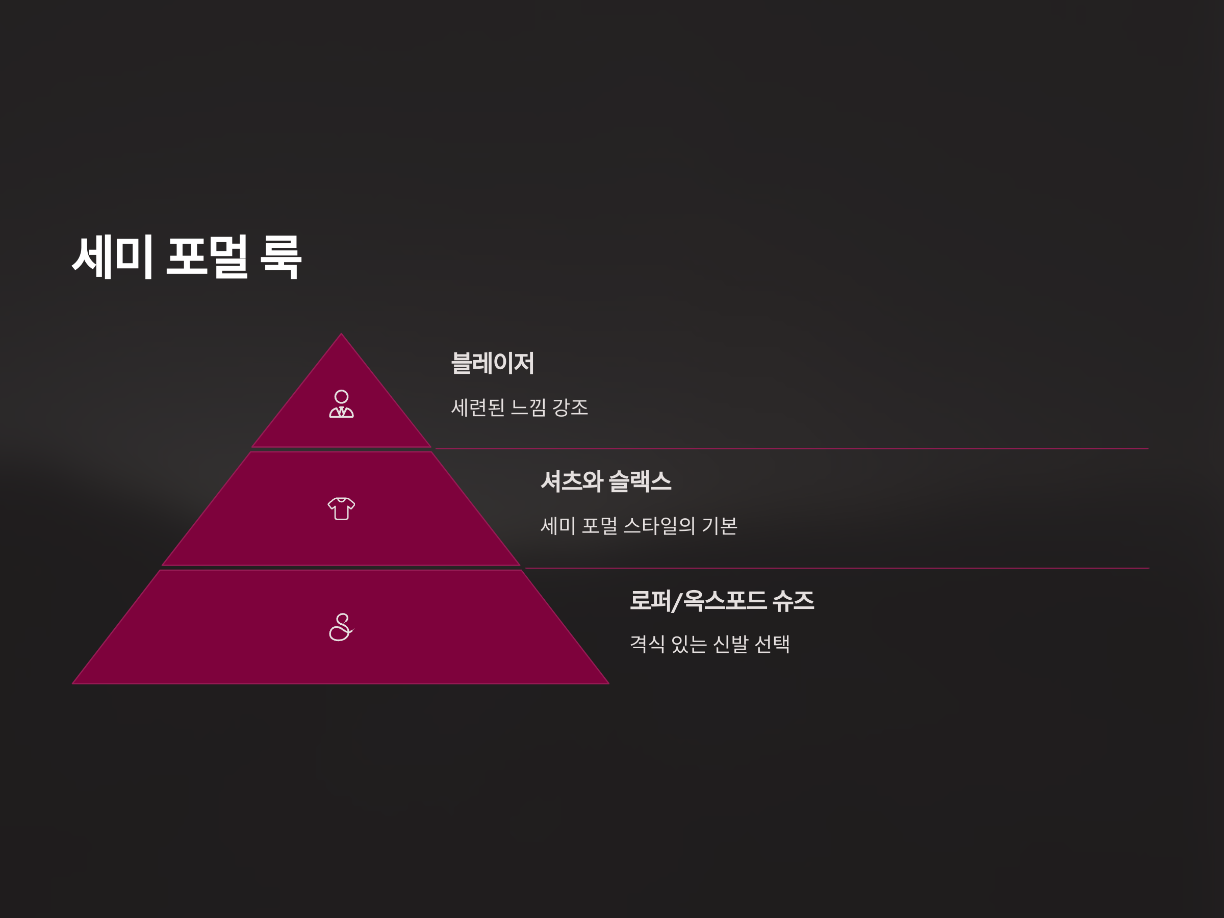 세미 포멀 룩은 비즈니스 미팅이나 격식을 갖춘 자리에 적합하면서도 지나치게 딱딱하지 않게 스타일을 살릴 수 있는 조합입니다. 좀 더 세련되게 보이지만 여전히 편안함을 유지할 수 있는 스타일을 원한다면 이 방법을 추천합니다.