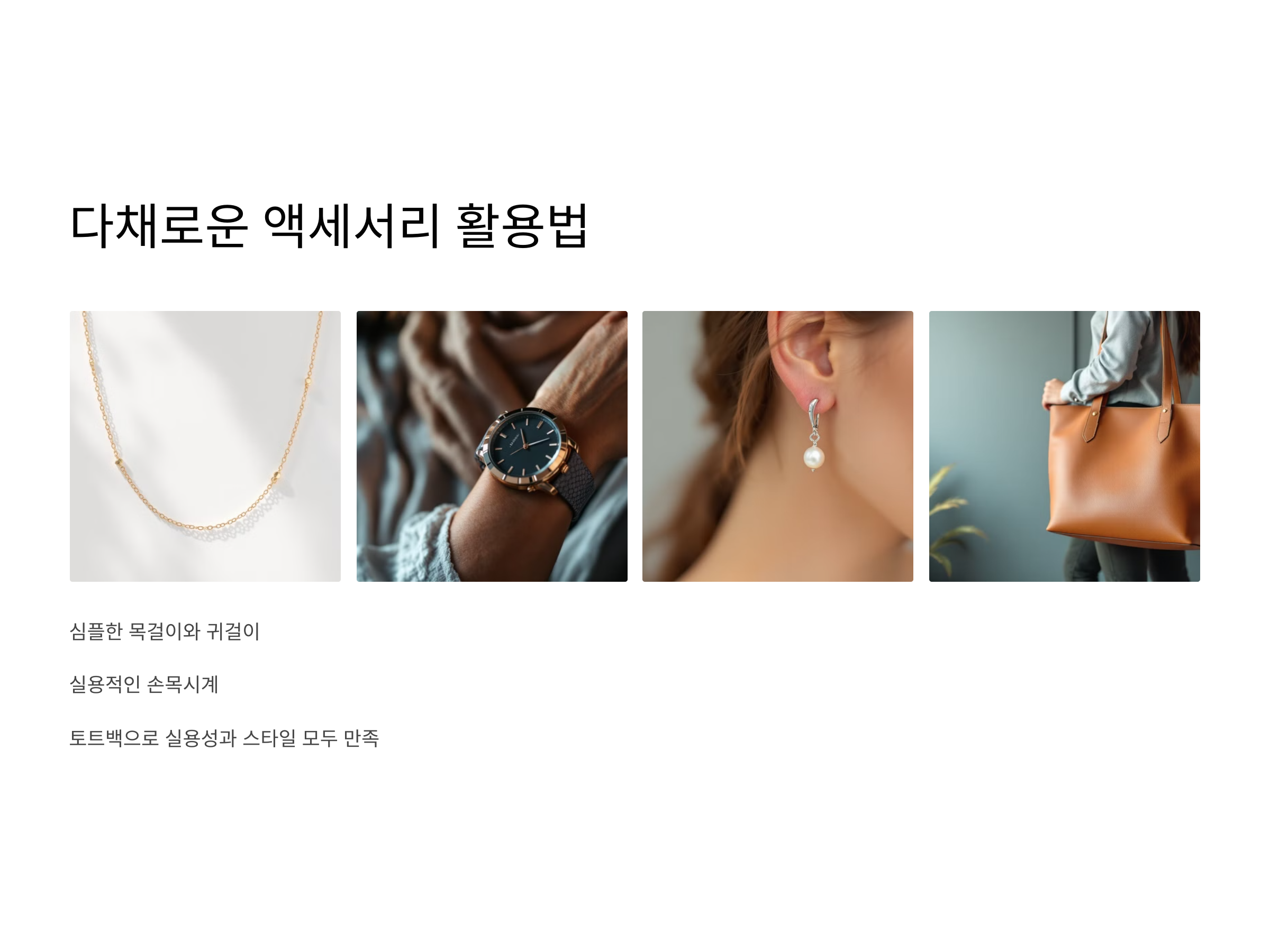 액세서리는 심플한 옷에 포인트를 줄 수 있는 중요한 아이템입니다. 워킹맘이 가장 선호하는 액세서리로는 목걸이나 귀걸이, 손목시계 등 간단하면서도 세련된 아이템들이 있습니다. 너무 과하지 않게 심플한 액세서리를 선택하면 오피스룩에서도 부담 없이 착용할 수 있습니다.
