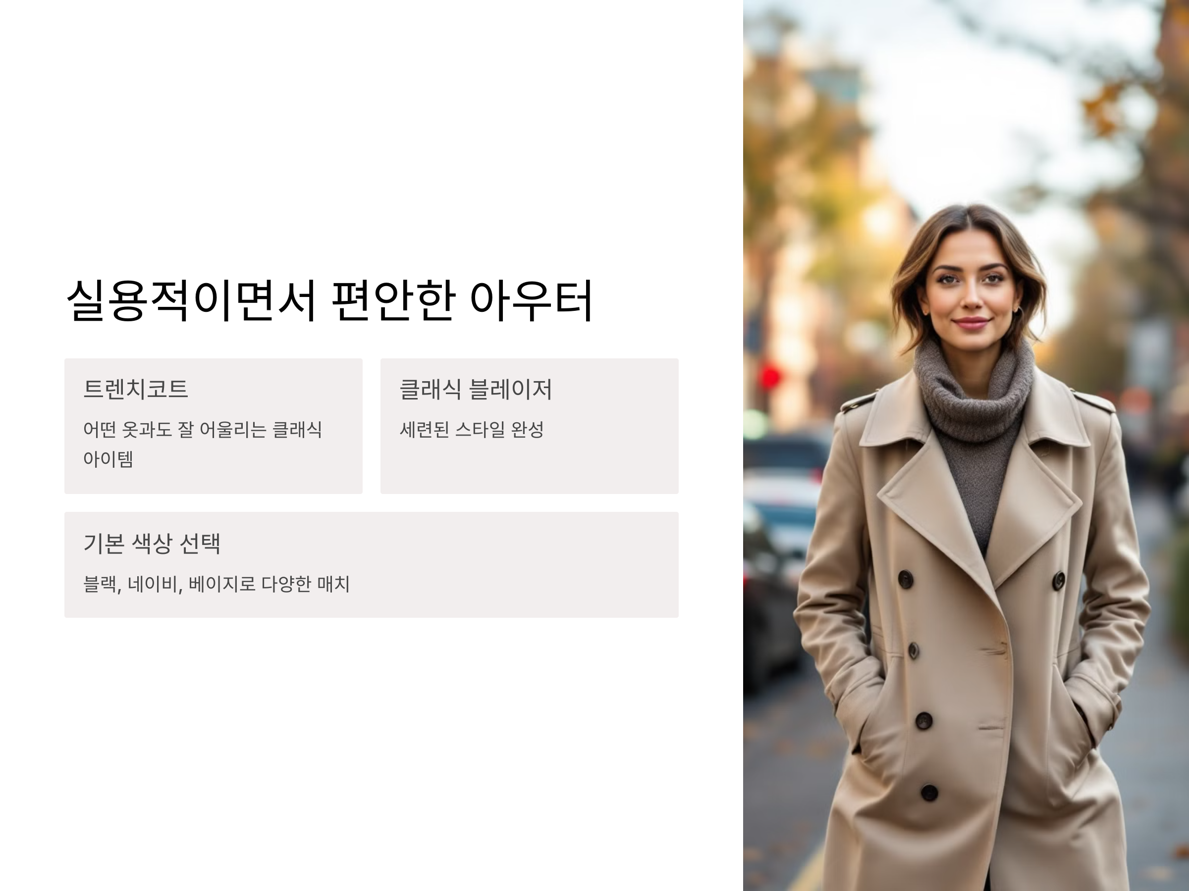 워킹맘의 패션에서 아우터는 중요한 역할을 합니다. 특히, 아침 출근길이나 퇴근 후 육아를 할 때, 날씨나 상황에 맞게 쉽게 입을 수 있는 아우터가 필요합니다. 트렌치코트나 클래식한 블레이저는 어떤 옷과도 잘 어울려 실용적이고 세련된 스타일을 완성할 수 있습니다.