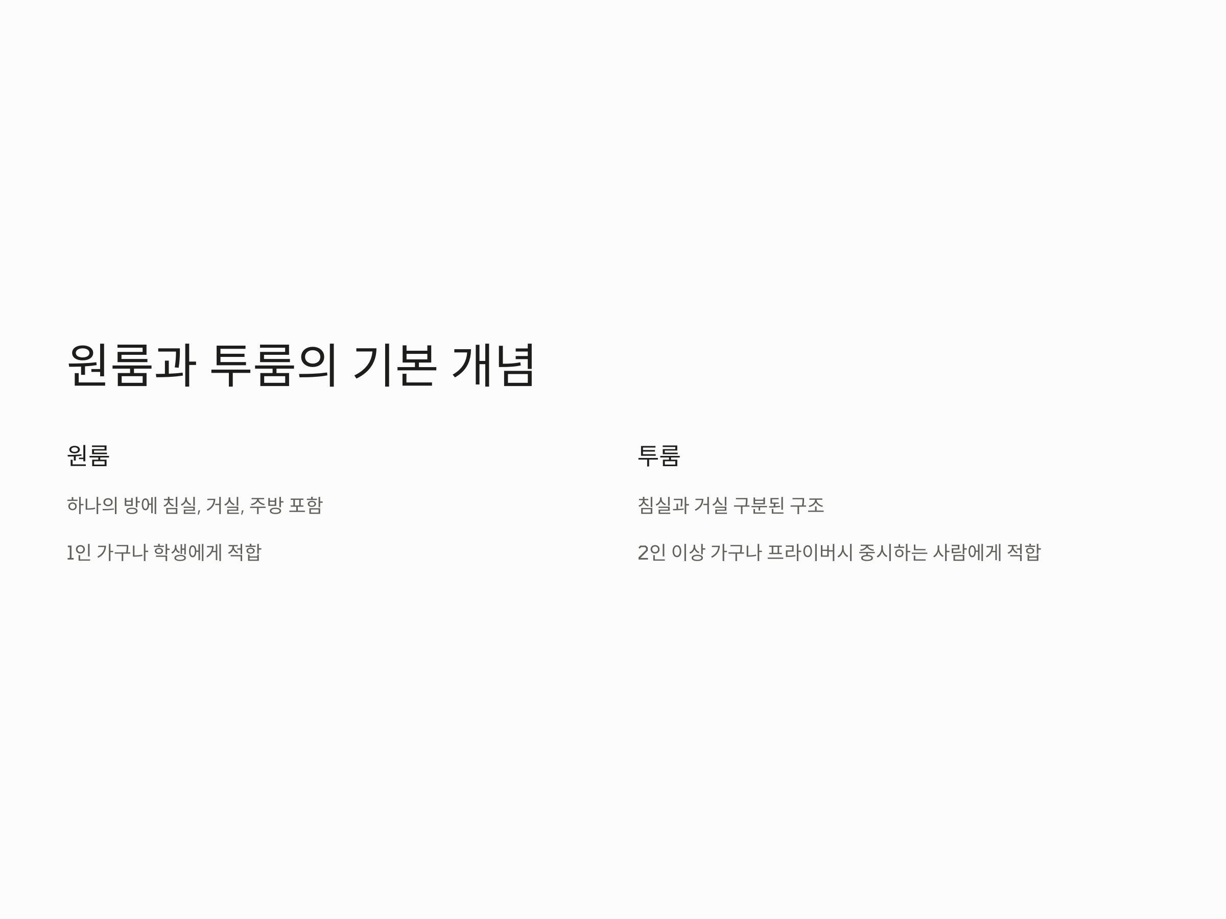 투룸은 별도의 침실과 거실이 구분되어 있는 구조로, 2인 이상의 가구나 프라이버시를 중시하는 거주자에게 적합합니다. 공간이 분리되어 있어 생활 영역을 구분할 수 있으며, 보다 편안한 생활이 가능합니다.