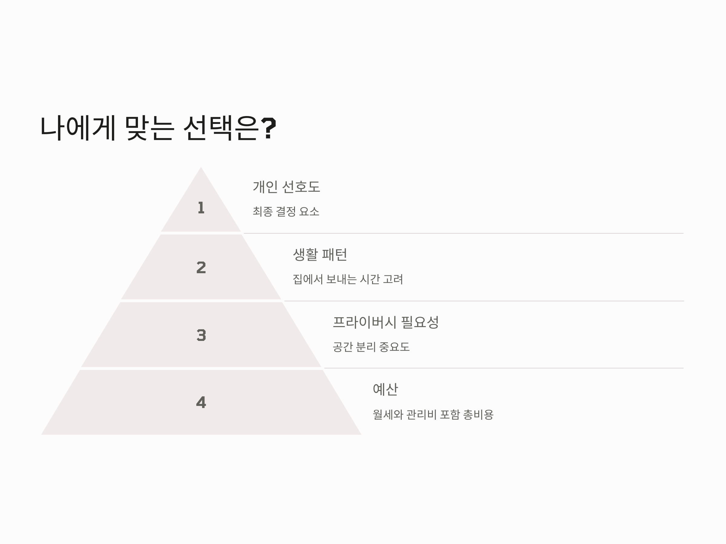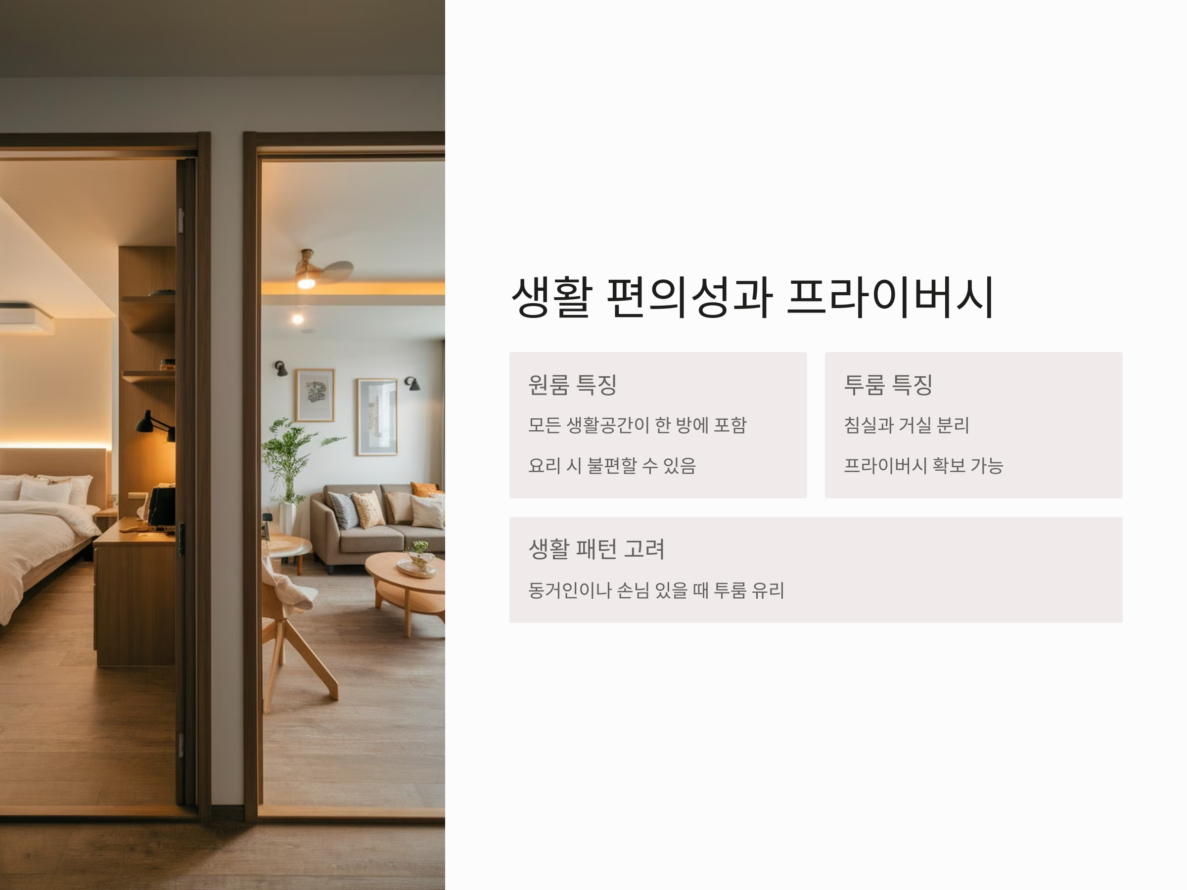 거주 목적과 생활 스타일에 따라 원룸과 투룸 중 어떤 것을 선택할지 결정해야 합니다. 예를 들어, 직장 근처에서 잠만 자는 용도로 거주할 계획이라면 원룸이 경제적일 수 있습니다. 반면, 재택근무를 하거나 집에서 많은 시간을 보내는 경우 투룸이 더 편안한 생활을 제공할 수 있습니다.