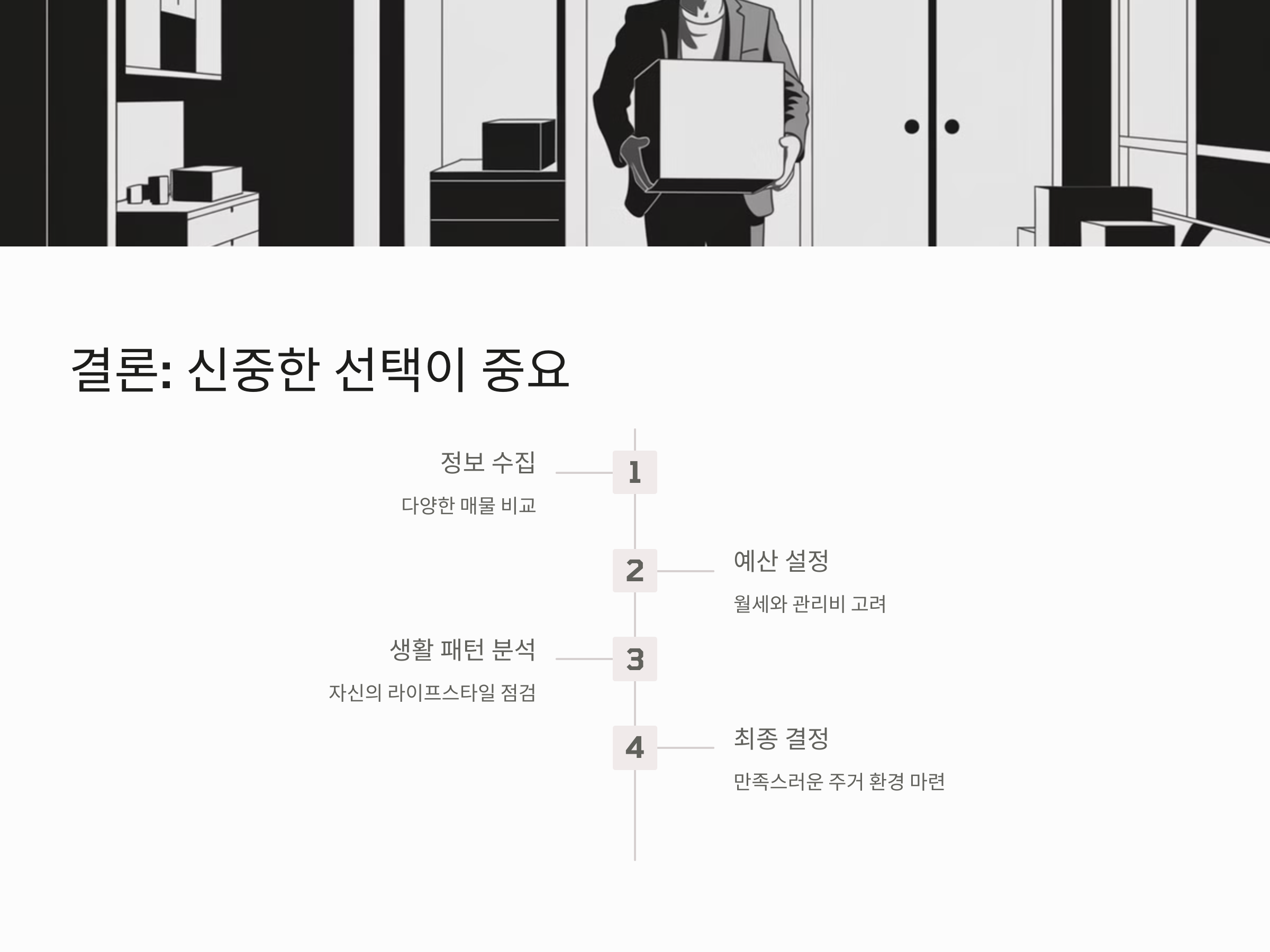 원룸과 투룸 중 어떤 것을 선택할지는 개인의 상황과 선호도에 따라 다릅니다. 예산, 생활 패턴, 프라이버시 필요성 등을 고려하여 자신에게 가장 적합한 주거 형태를 선택하는 것이 중요합니다. 신중한 선택을 통해 만족스러운 주거 환경을 마련하시길 바랍니다.