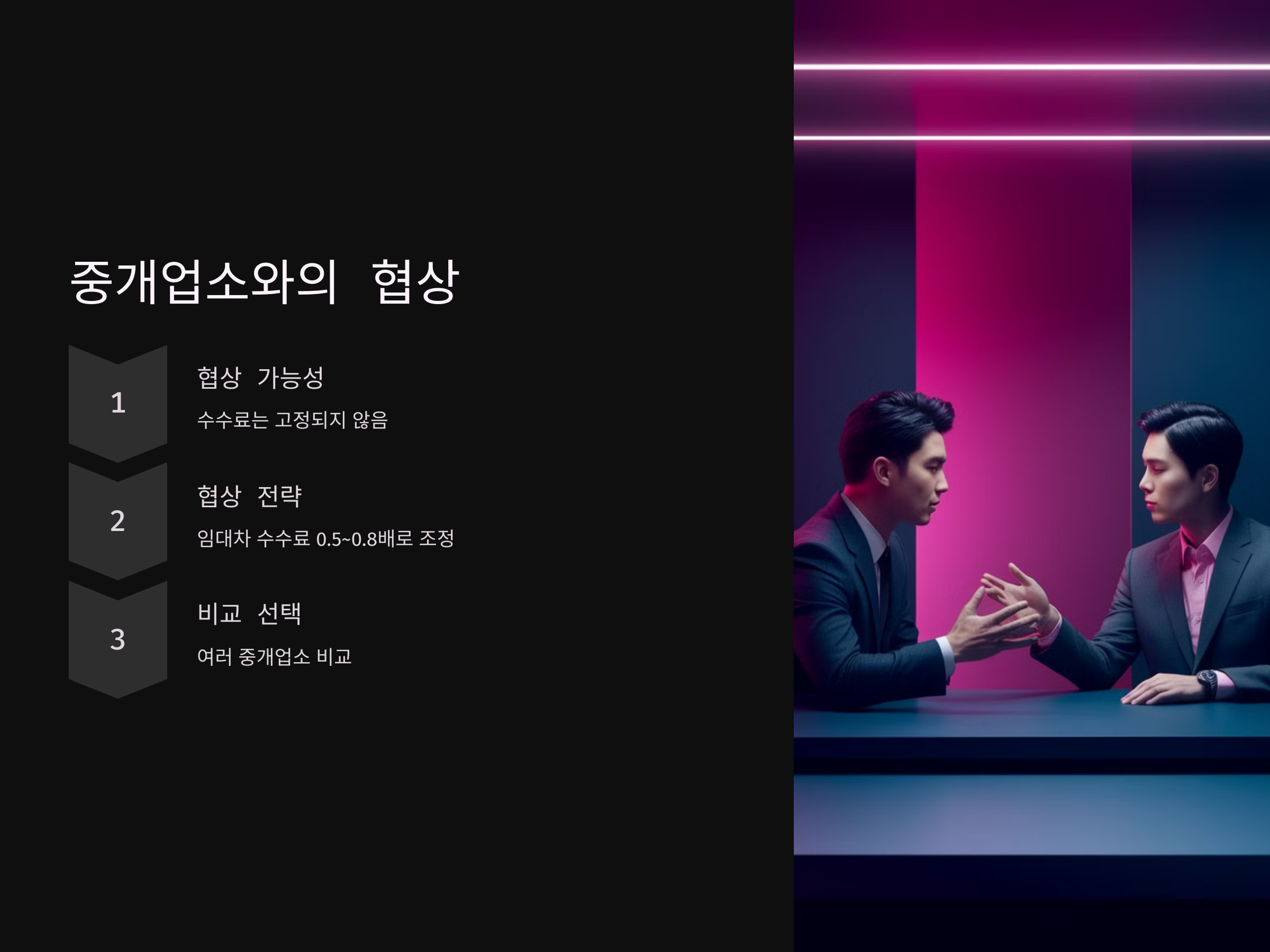 - 중개업소와 협상: 거래 전 중개업소와 협상하여 수수료를 줄일 수 있습니다.