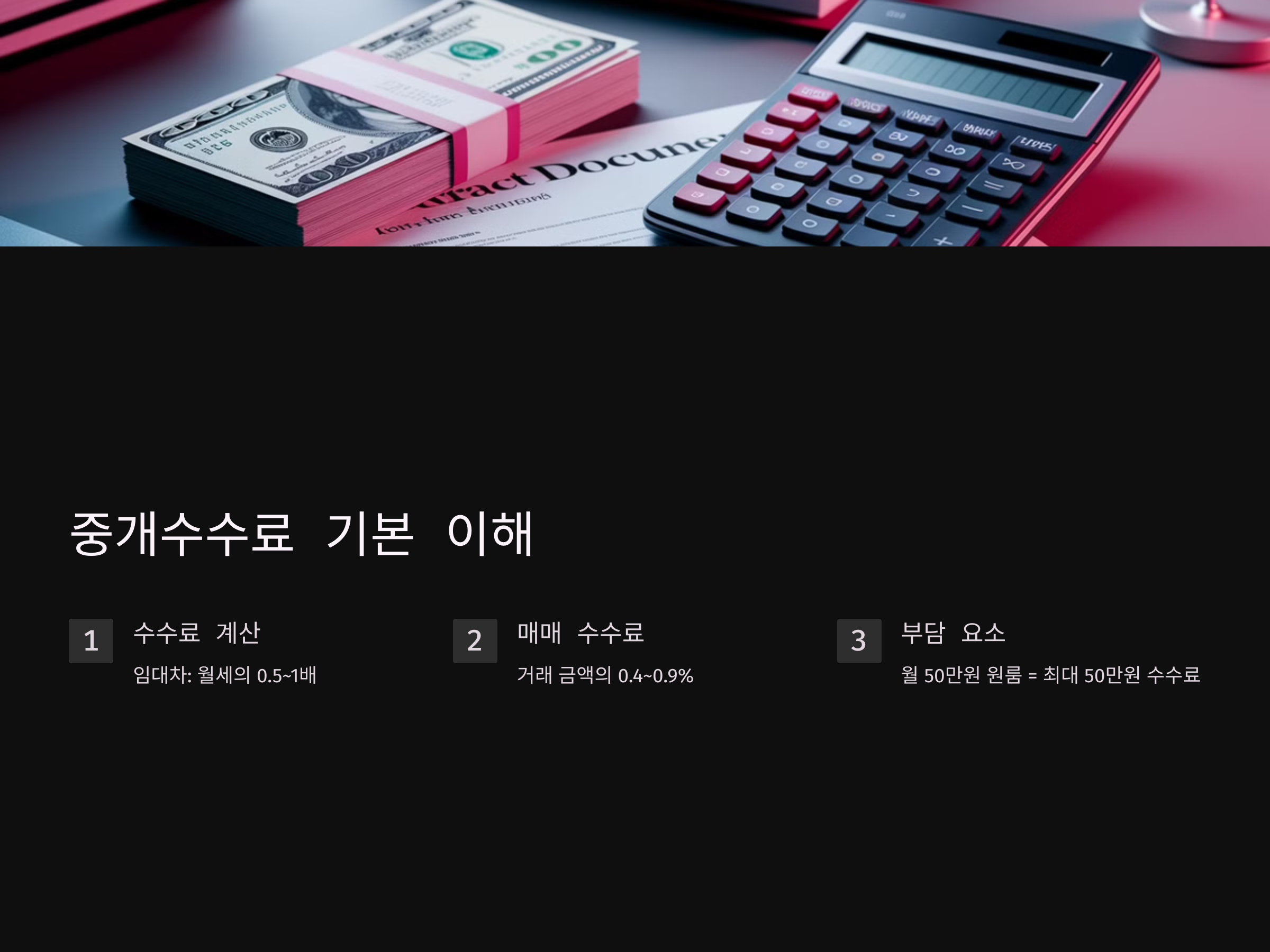 예를 들어, 월세가 50만 원인 원룸의 경우, 중개수수료는 보통 월세의 0.5배에서 1배 정도인 25만 원에서 50만 원 정도가 될 수 있습니다. 또한, 매매 계약에서는 거래 금액의 0.4%에서 0.9%까지 수수료가 부과됩니다. 이처럼 중개수수료가 상당히 부담스럽기 때문에 절감 방법에 대한 관심이 높아지고 있습니다.