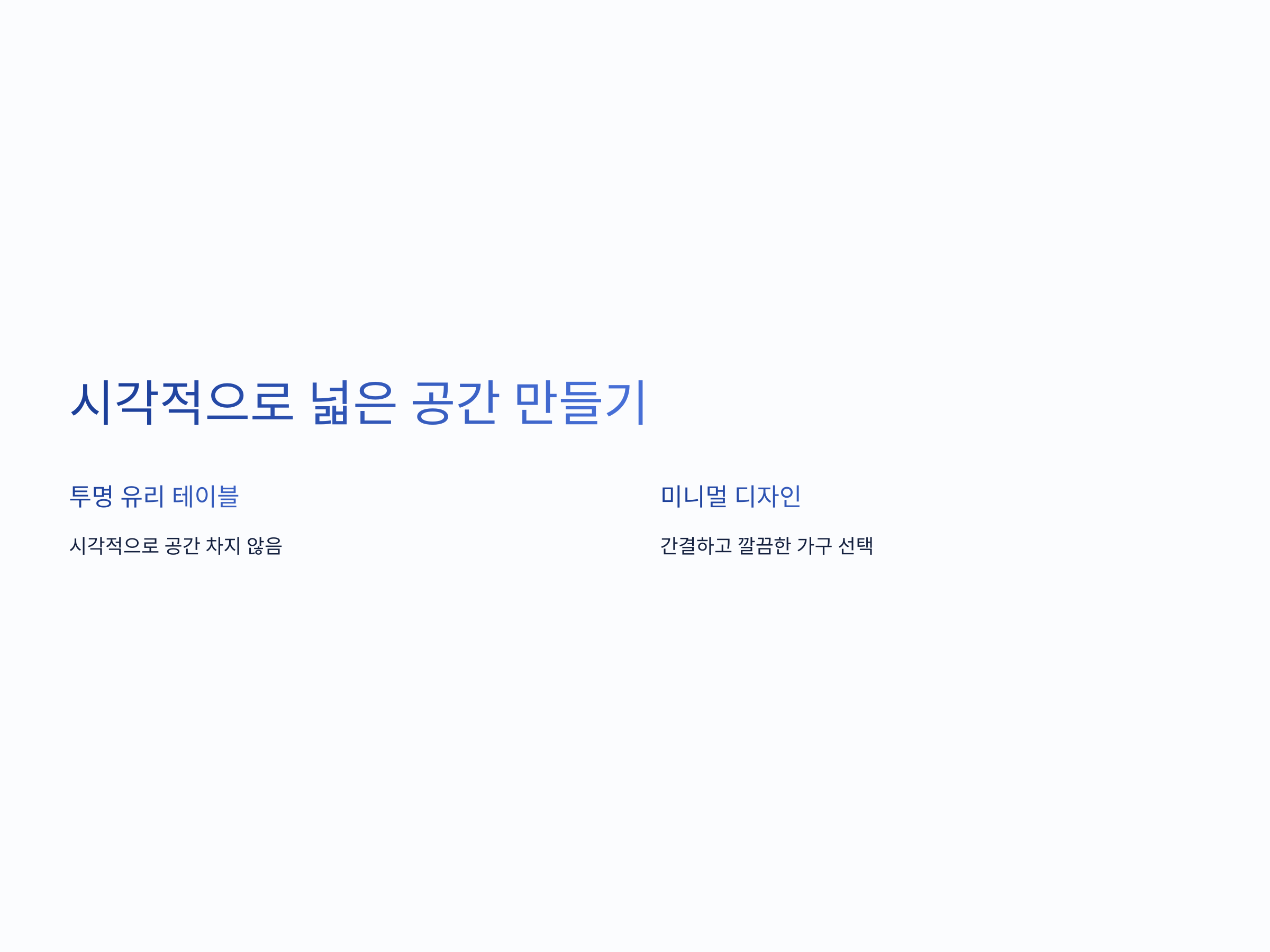 투명한 유리 테이블은 시각적으로 공간을 차지하지 않는 효과를 줍니다. 작은 공간에서 둔탁한 나무 테이블이나 커다란 의자 대신, 유리 테이블을 사용하면 시각적으로 공간을 더 넓어 보이게 만들 수 있습니다.