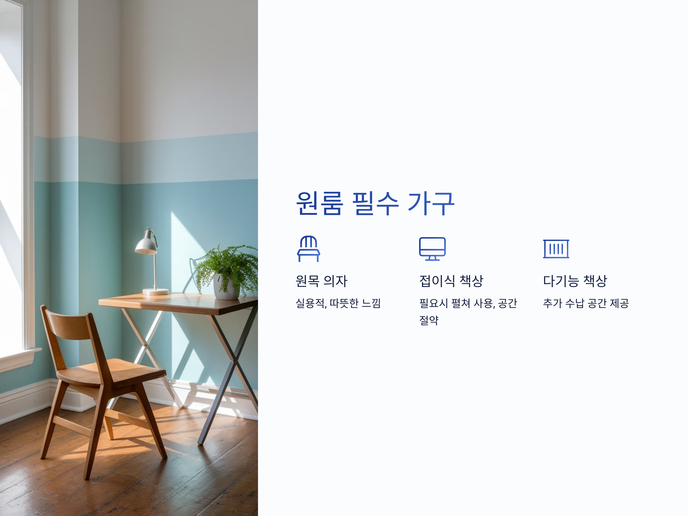 소형 가구는 기능뿐만 아니라, 공간을 시각적으로 넓게 만드는 역할도 해야 합니다. 원룸의 작은 공간을 더욱 넓고 편안하게 느껴지게 하는 가구들을 추천합니다.