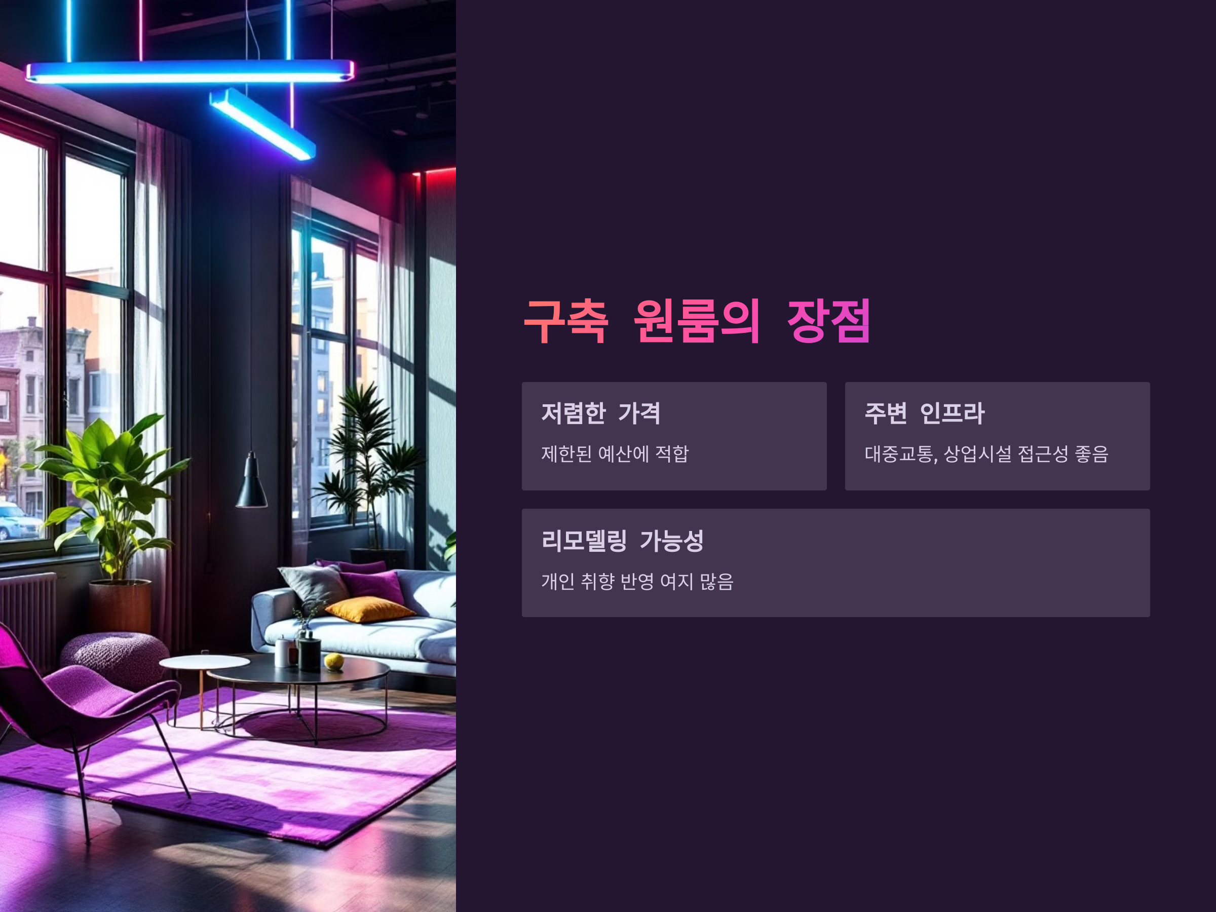 구축 원룸은 가격이 저렴하고, 주변 인프라가 잘 갖춰져 있어 생활 편의성이 높습니다. 또한, 리모델링을 통해 나만의 스타일로 꾸밀 수 있습니다.