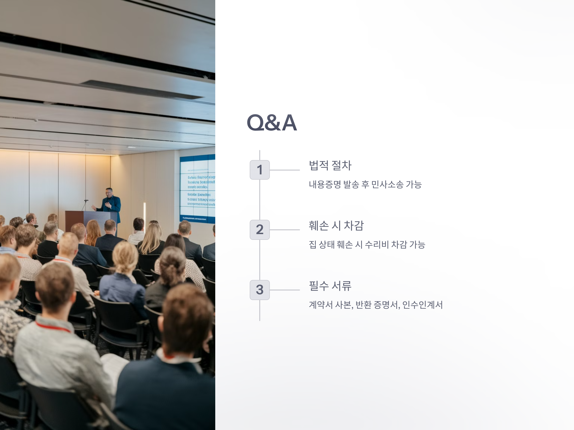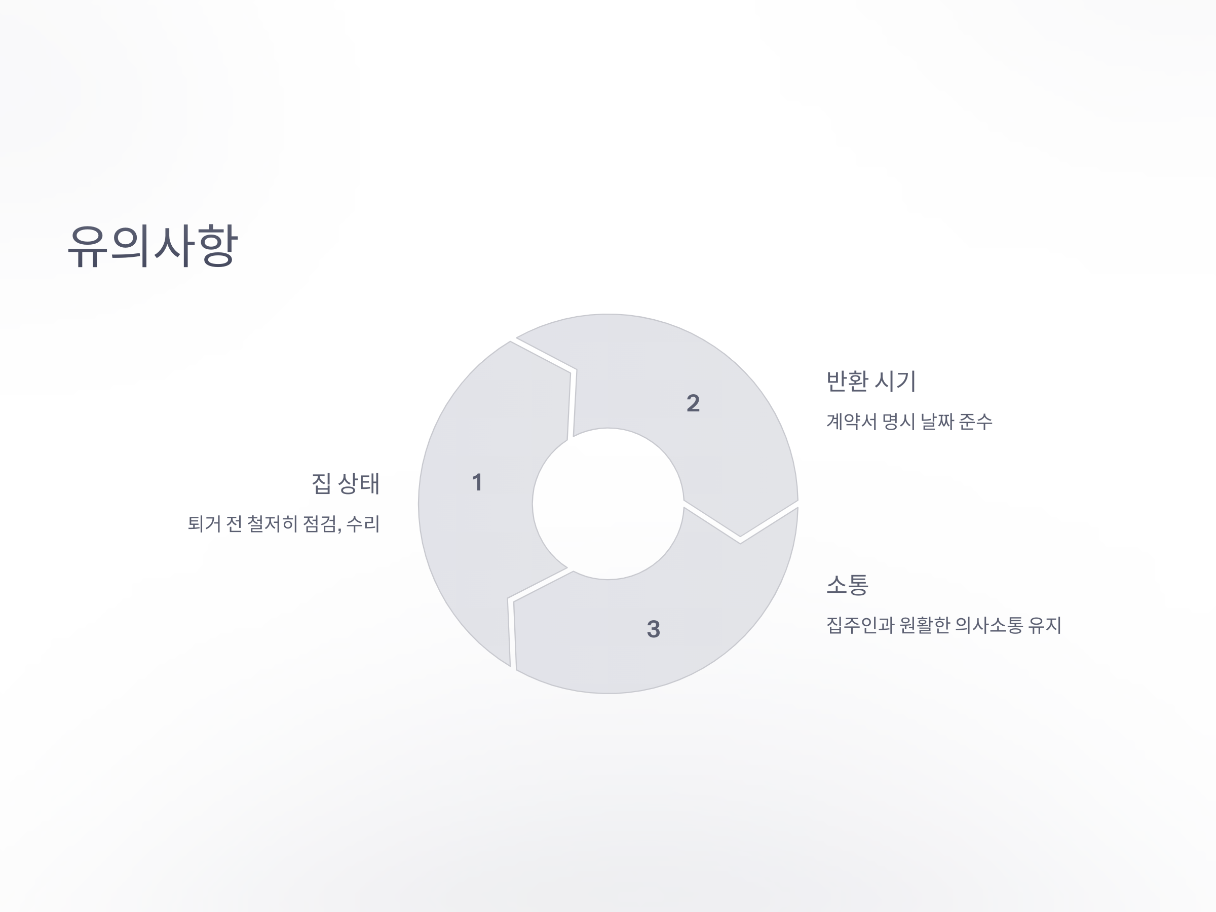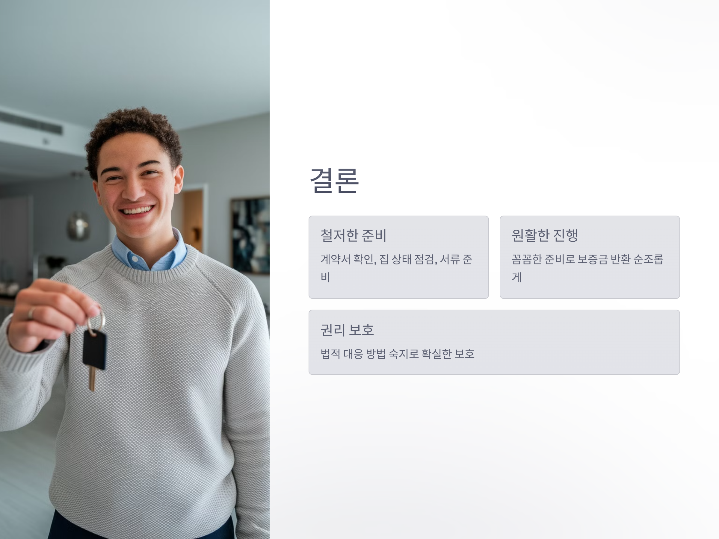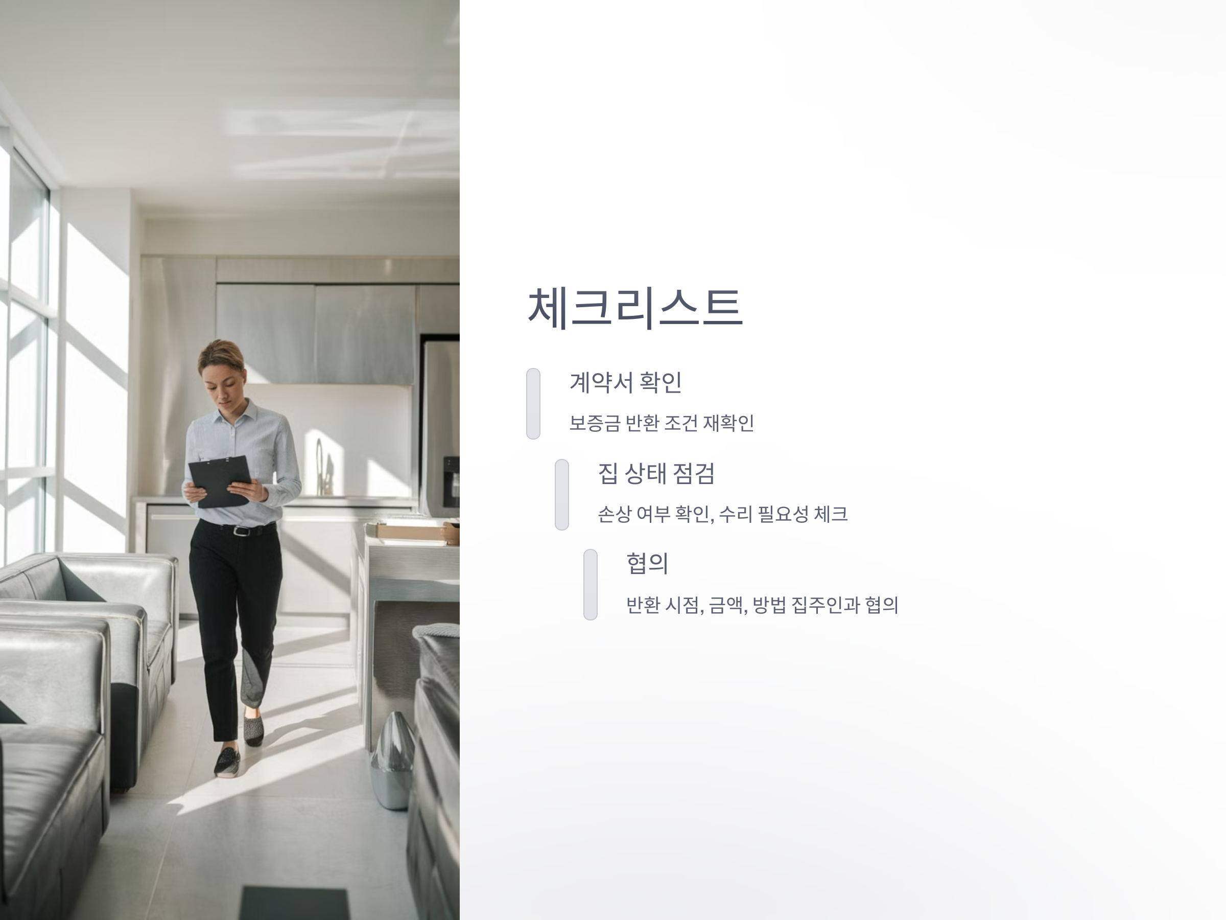 퇴거 전 집 상태를 철저히 점검하고, 수리할 부분이 있다면 미리 수리해두세요. 불필요한 비용을 줄이고, 반환받을 금액을 온전히 받을 수 있습니다.