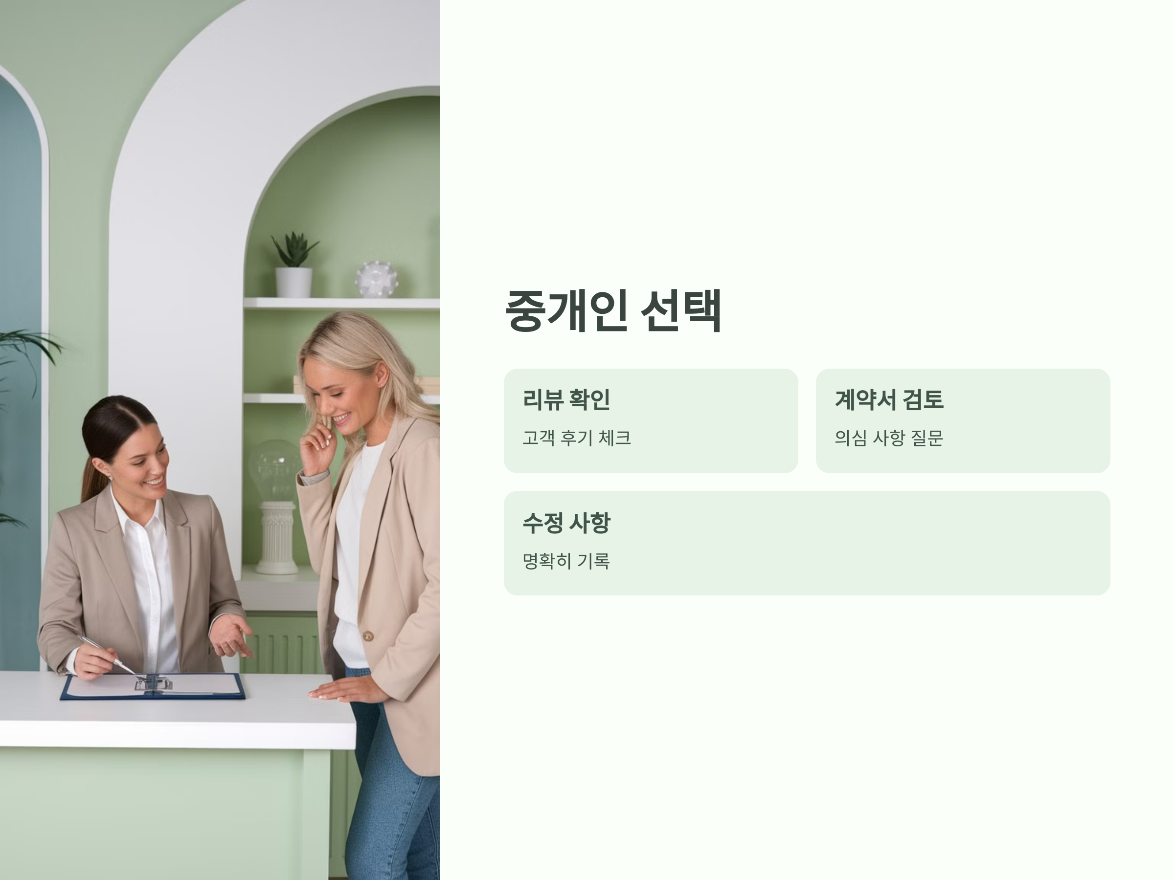 - 리뷰와 평가: 인터넷에서 중개인의 리뷰와 평가를 확인하세요. 고객들의 후기가 좋은 중개인은 보통 신뢰할 수 있습니다.