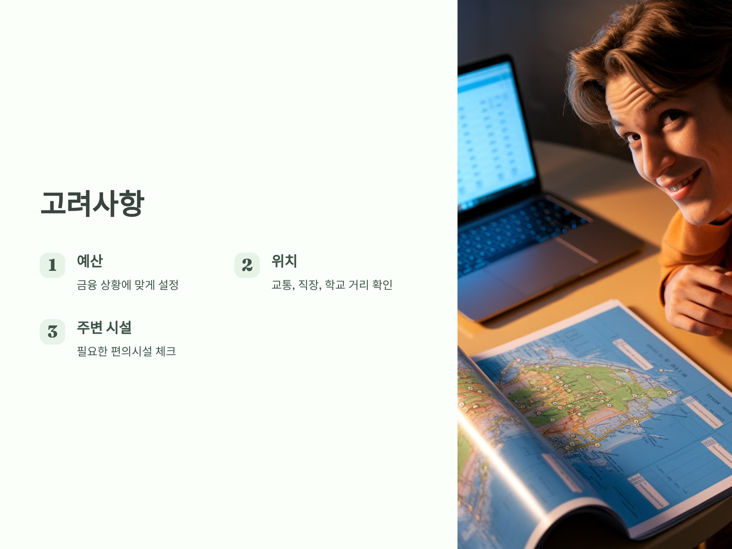 - 위치: 위치는 정말 중요한 요소입니다. 대중교통을 이용해야 하는지, 회사나 학교와의 거리는 어떻게 되는지, 주변에 필요한 시설이 있는지 등을 미리 확인하세요.