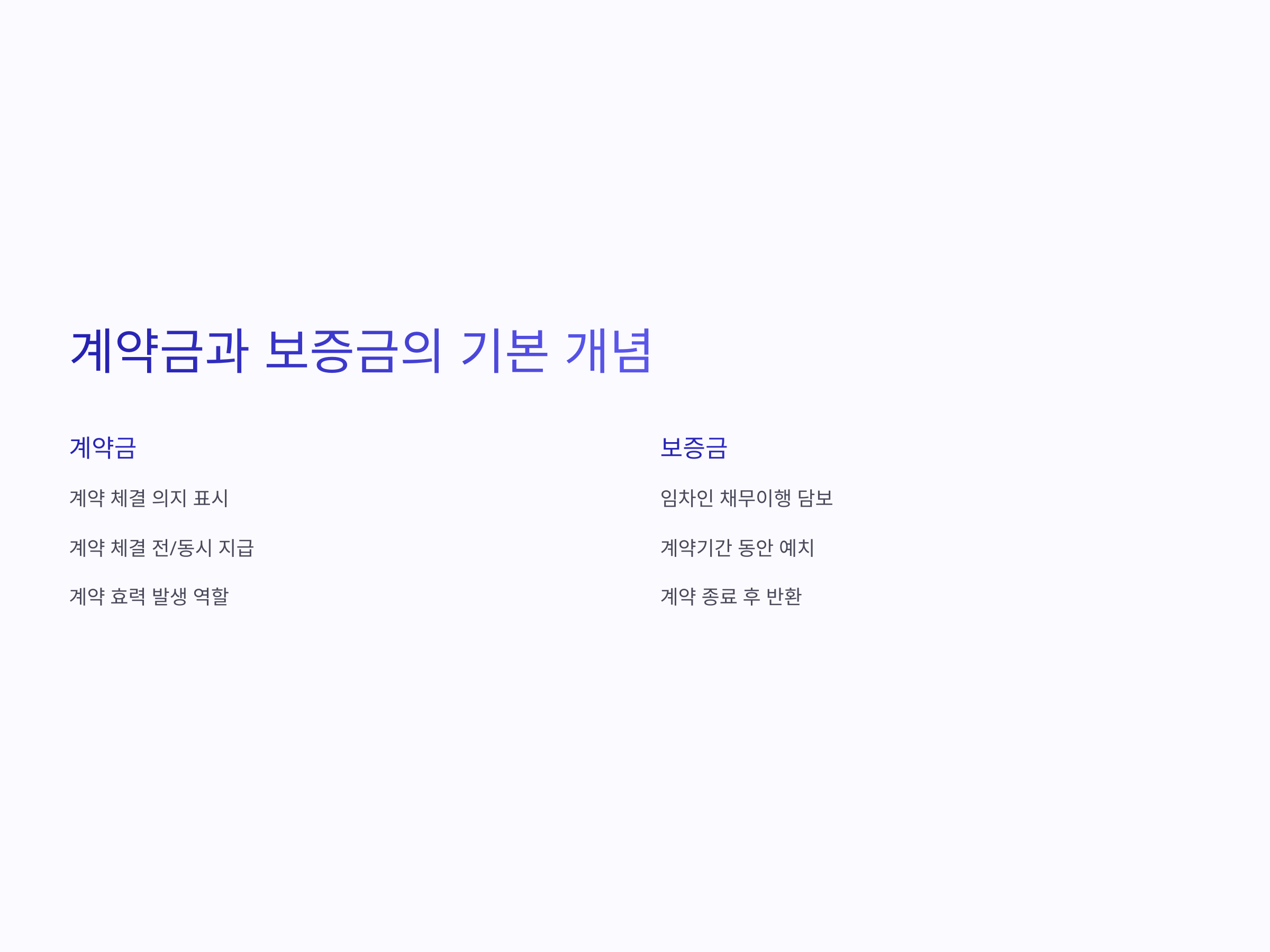 반면 보증금은 임대차 계약 기간 동안 임차인의 채무이행을 담보하기 위해 임대인에게 맡겨놓는 금액입니다. 월세와는 별도로 한 번에 큰 금액을 예치하고, 계약 종료 후 일정한 조건 하에 반환받는 구조로 되어 있습니다. 보증금은 주로 임차인이 월세를 밀리거나 시설에 손해를 끼쳤을 경우 이를 보전하기 위해 설정됩니다. 즉, 계약금은 '계약 체결의 의사 표현', 보증금은 '계약 기간 내 의무 이행의 담보'라는 점에서 기능과 목적이 다르다는 점이 핵심입니다.