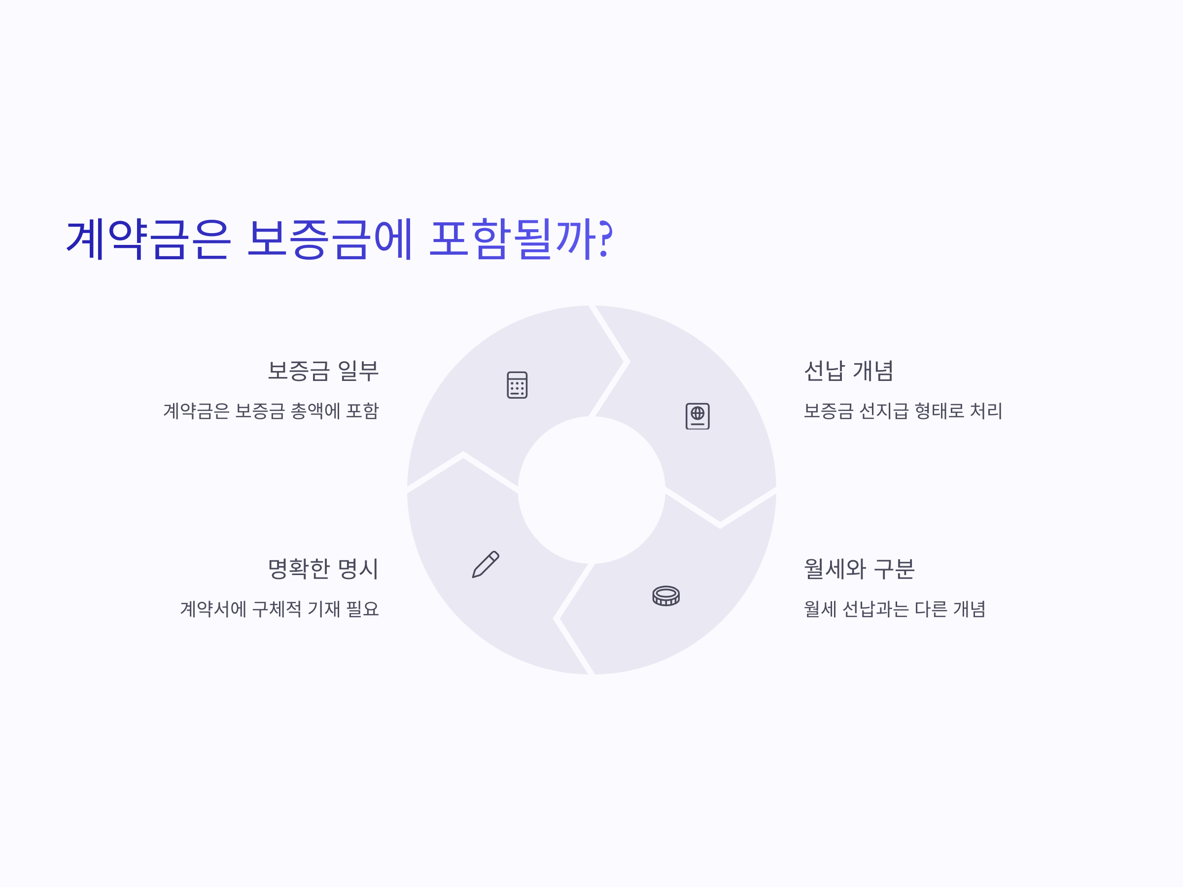 다만 주의할 점은 계약금이 '월세의 일부'로 간주되지 않는다는 것입니다. 이는 혼동의 여지가 많은 부분인데, 계약금은 임차인이 월세 선납 개념으로 지급하는 금액이 아니라, 계약의 체결과 보증금의 일부 지급을 위한 절차이기 때문에 그 용도가 다릅니다. 이러한 계약 구조를 잘 이해하지 못하고 임대차 계약을 진행하면, 나중에 정산 시 오해가 발생할 수 있으므로 계약서 내 금액 항목별로 명확한 명시가 필수적입니다.