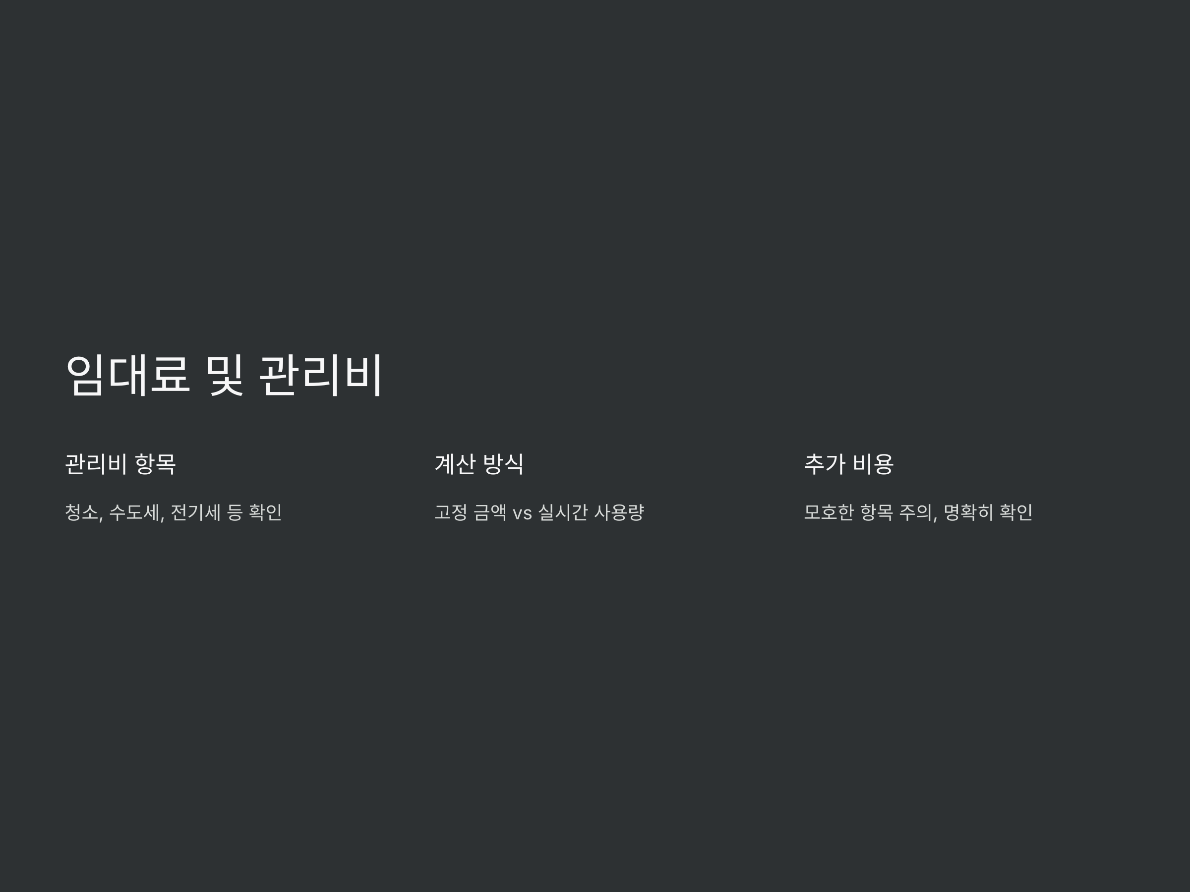 월세 계약에서 임대료뿐만 아니라 관리비 또한 중요한 항목입니다. 관리비에는 공용 부분의 청소, 수도세, 전기세 등 다양한 항목이 포함될 수 있는데, 이를 정확히 확인하는 것이 중요합니다. 관리비는 매월 고정된 금액일 수도 있고, 실시간 사용량에 따라 달라질 수 있기 때문에 그 계산 방식도 계약서에 명시되어 있어야 합니다.