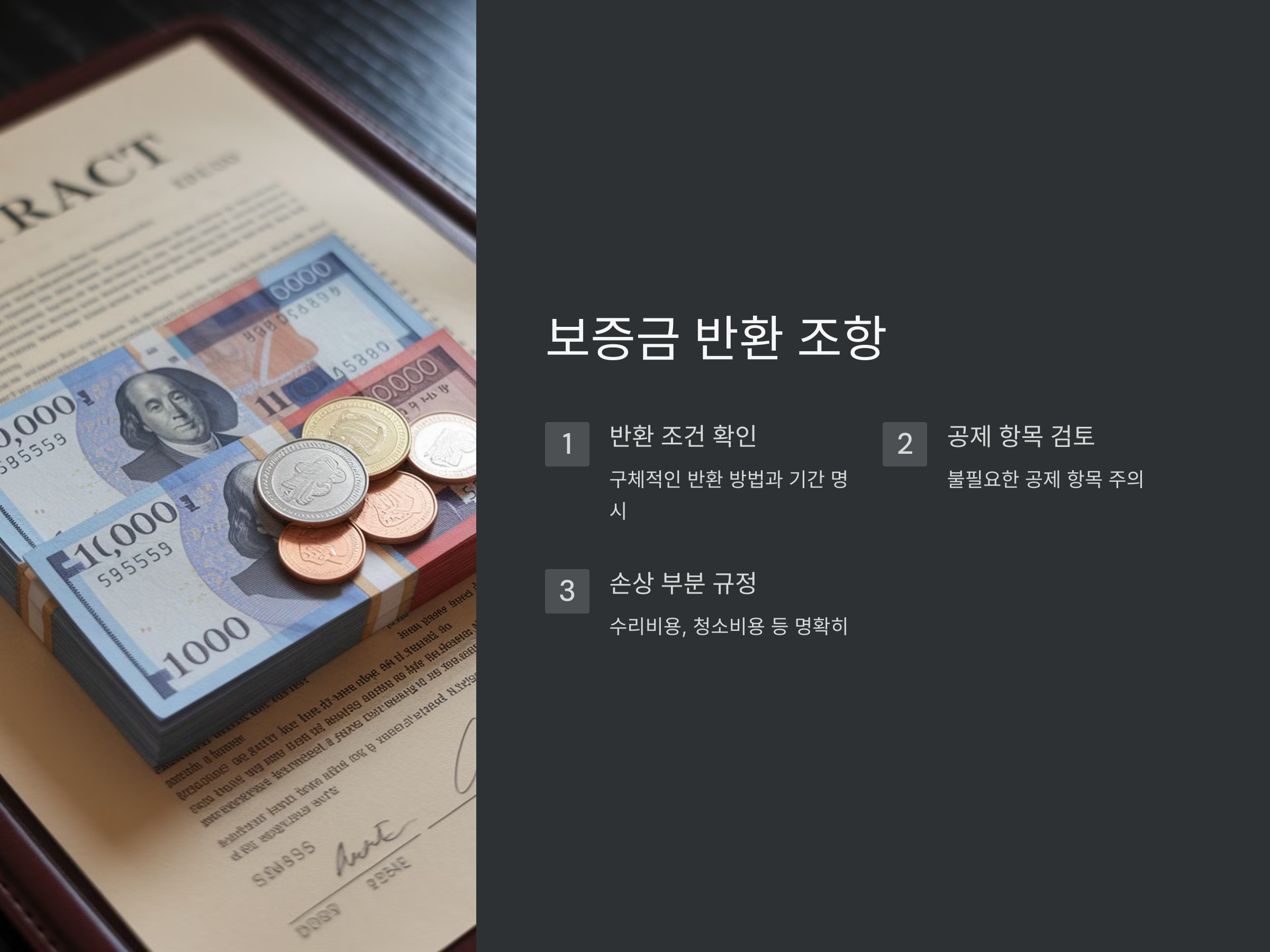 보증금은 월세 계약에서 가장 중요한 부분입니다. 계약서에 명시된 보증금 반환 조건을 꼼꼼히 확인해야 합니다. 특히, 계약 종료 후 보증금을 어떻게 돌려받을지에 대한 구체적인 사항이 중요합니다. 보증금 반환 시 집주인이 비용을 공제할 수 있는 항목이나 기간에 대한 내용도 반드시 확인해야 합니다.