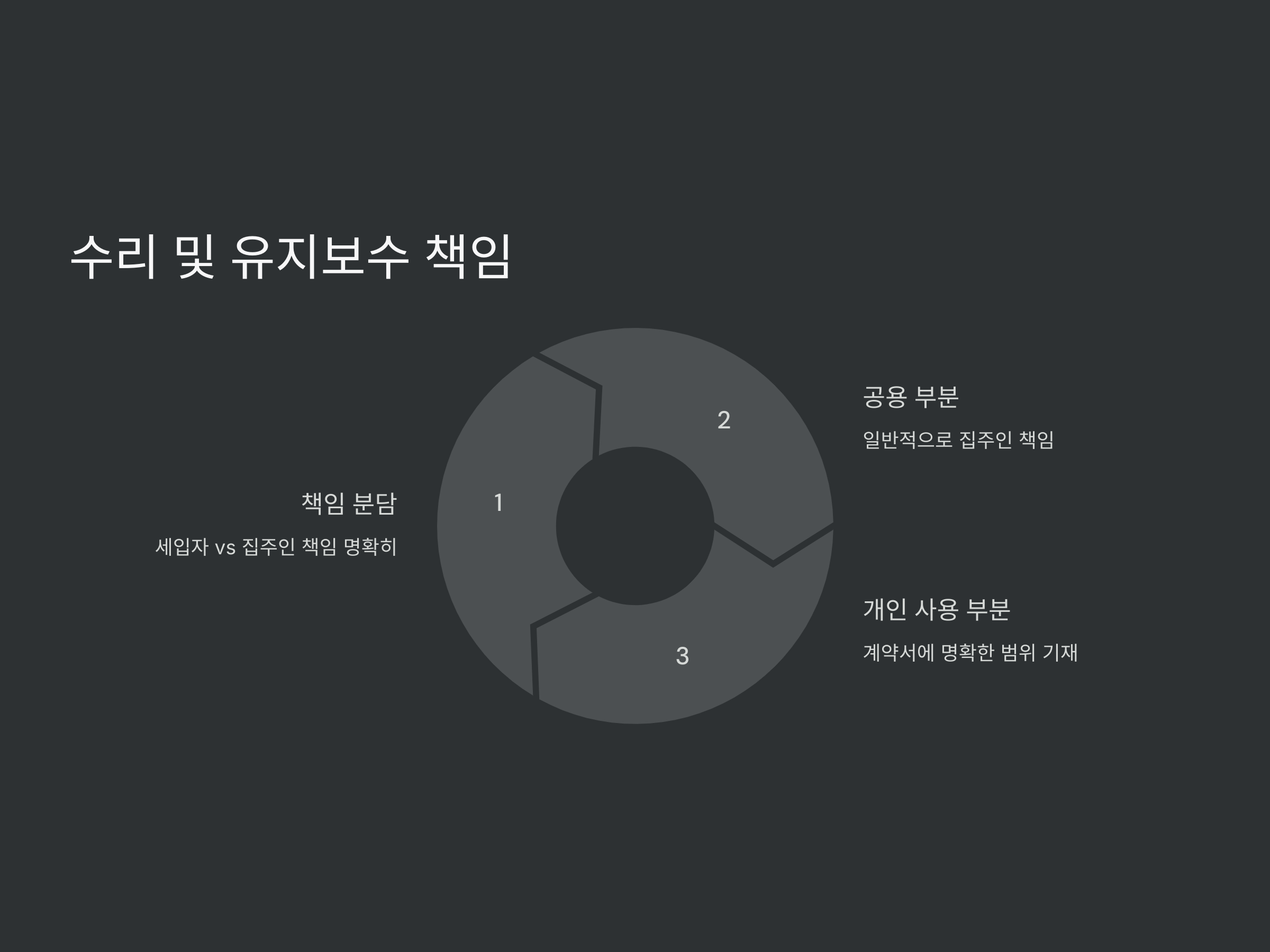 보통, 공용 부분의 유지보수는 집주인이 책임지지만, 세입자가 개인적으로 사용하는 부분에 대해서는 계약서에 명확한 수리 책임 범위가 기재되어 있어야 합니다. 이를 통해 나중에 발생할 수 있는 분쟁을 예방할 수 있습니다.