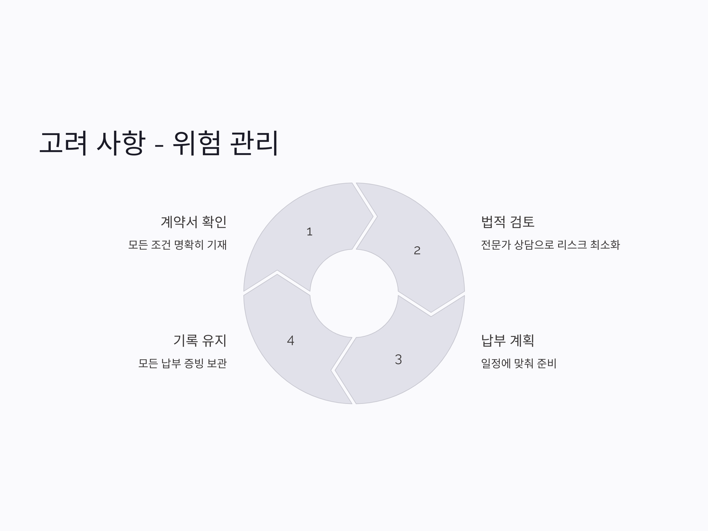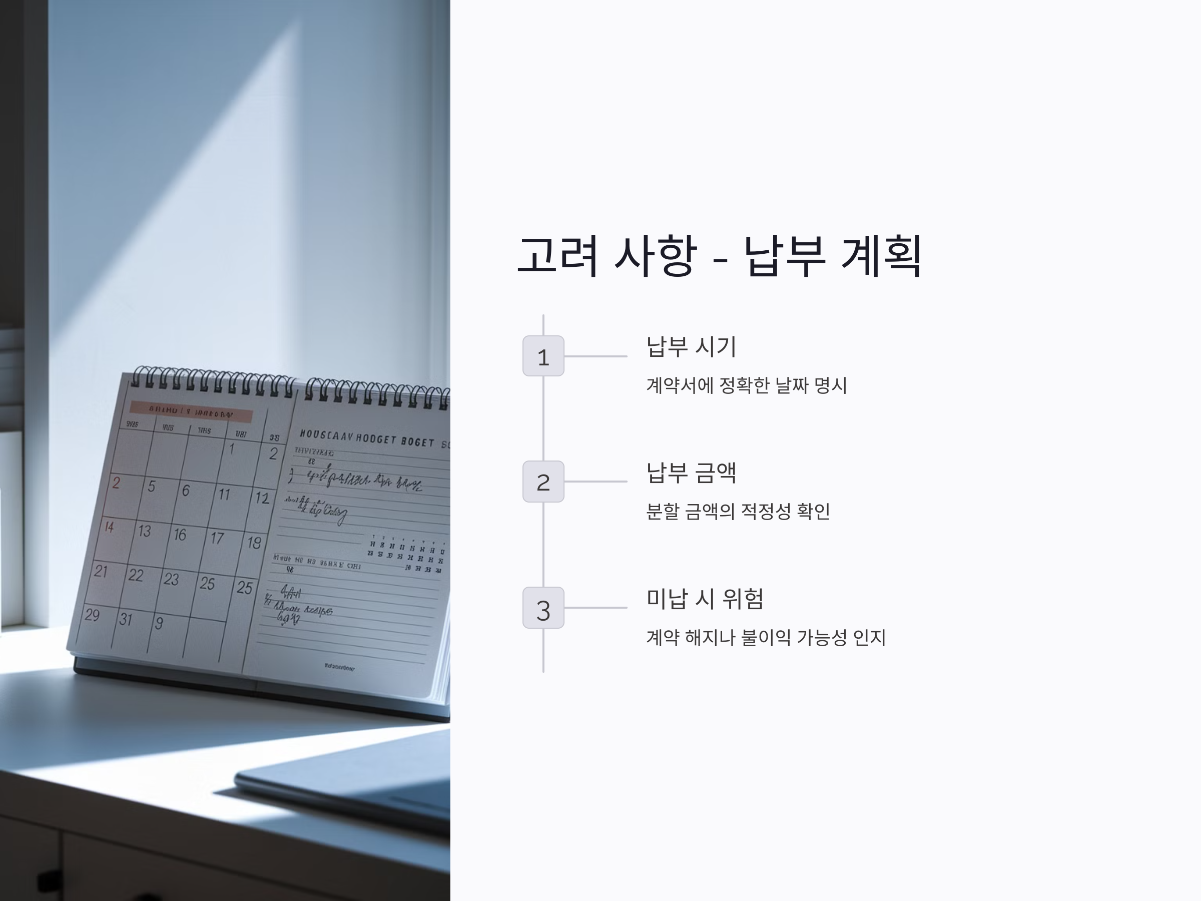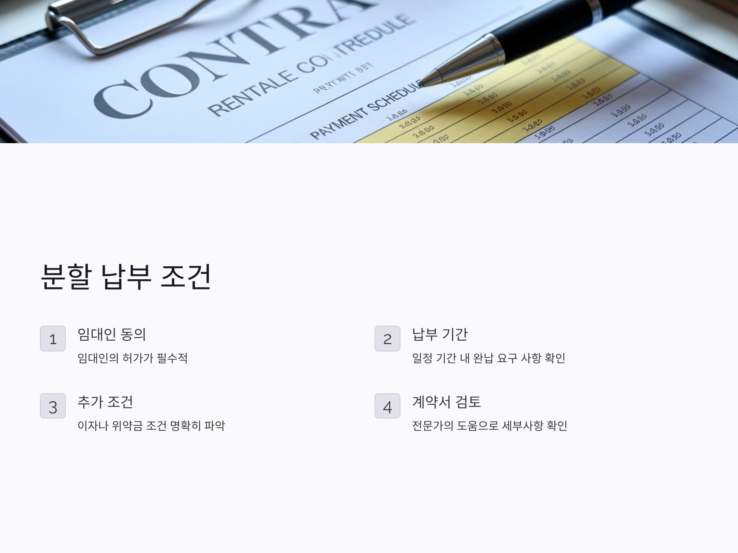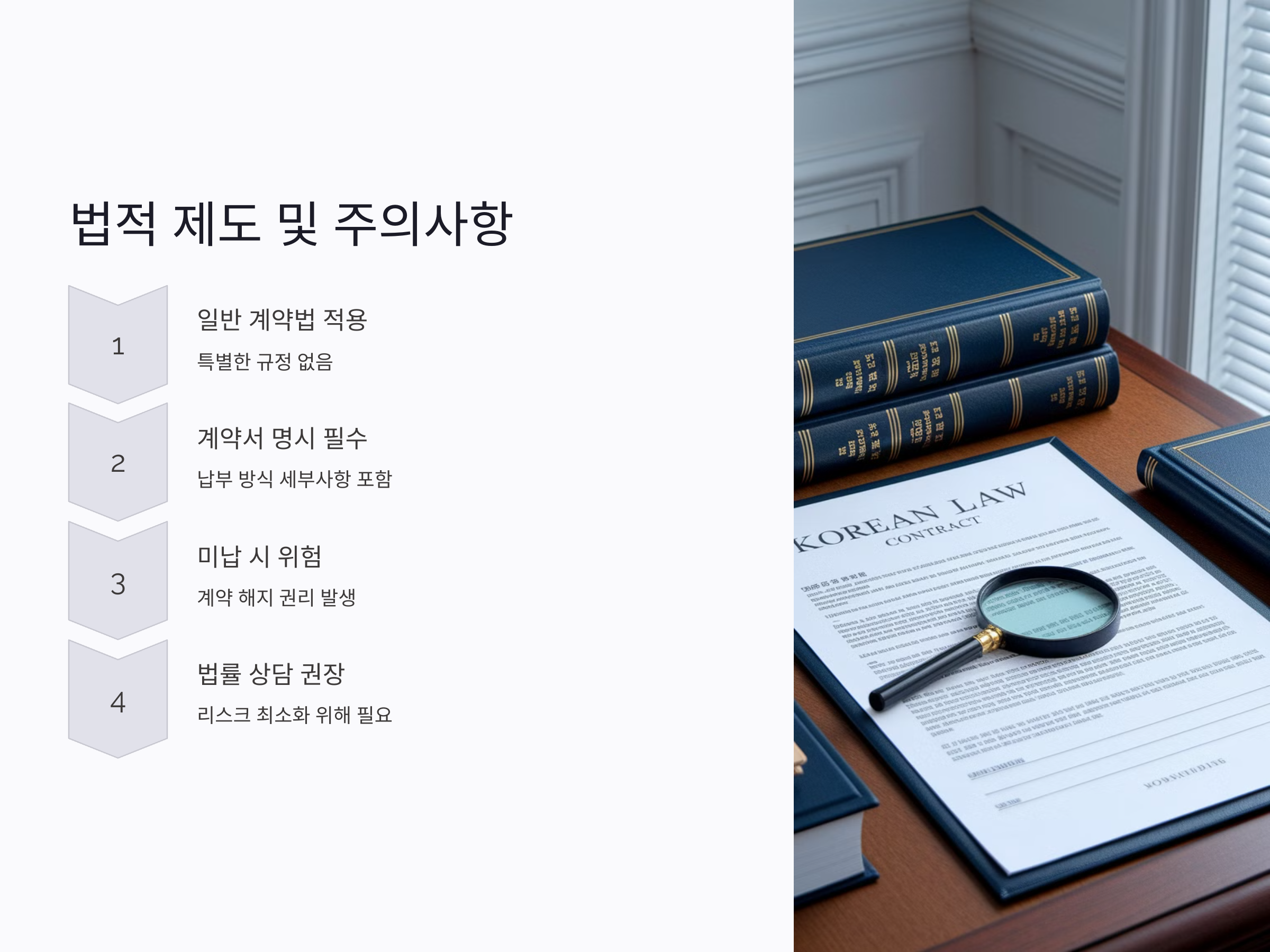 따라서 보증금 분할 납부 계약을 체결할 때는 반드시 납부 일정, 금액, 미납 시의 법적 절차 등을 정확히 이해하고, 계약서에 명확하게 반영되도록 해야 합니다. 또한, 계약 체결 전 법률 전문가와 상담을 통해 법적 리스크를 최소화하는 것이 좋습니다.