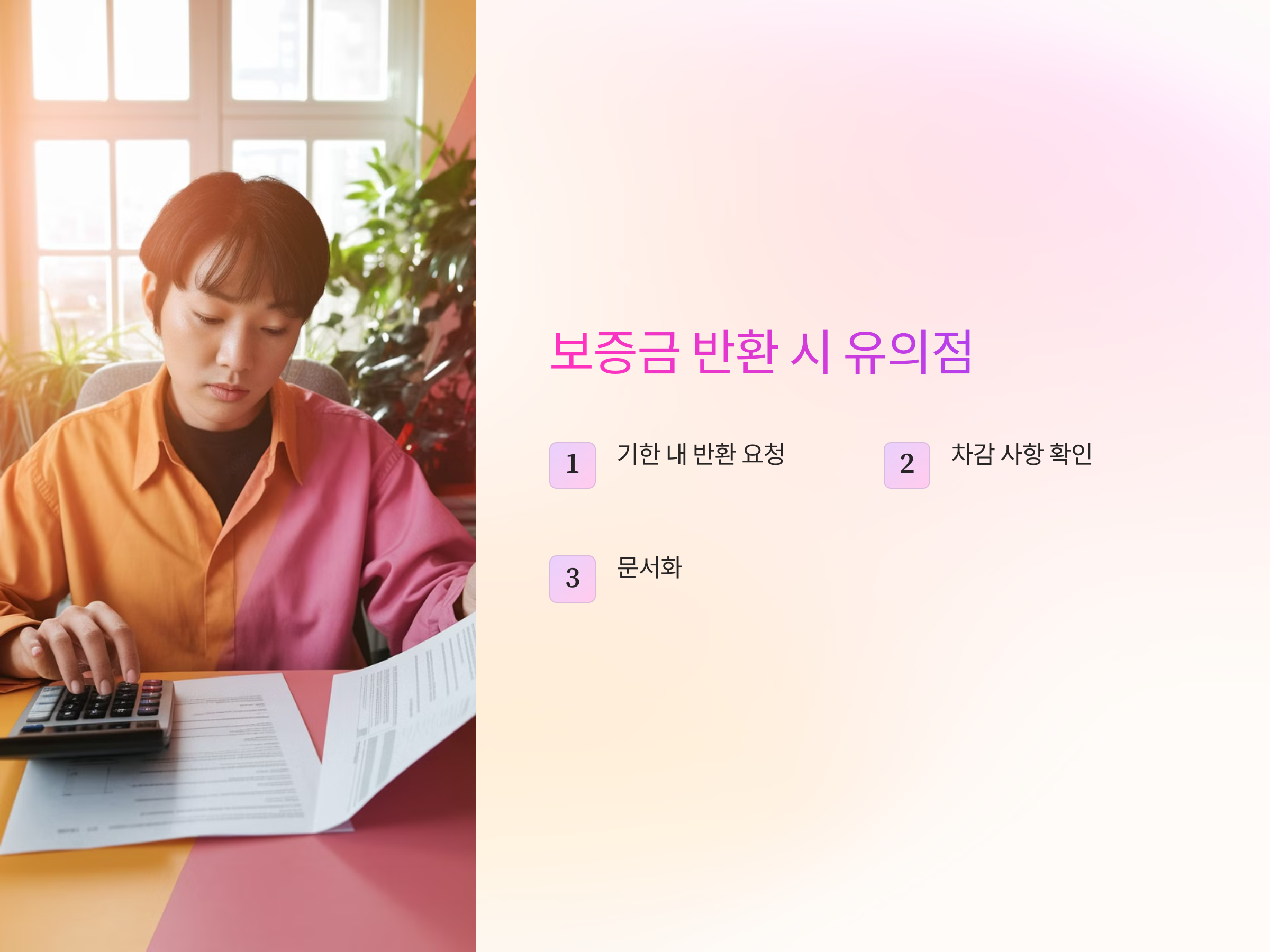 - 차감 사항 확인: 보증금에서 차감되는 금액에 대해서는 명확히 확인하고, 불합리한 부분이 있으면 바로 조정 요청을 해야 합니다.