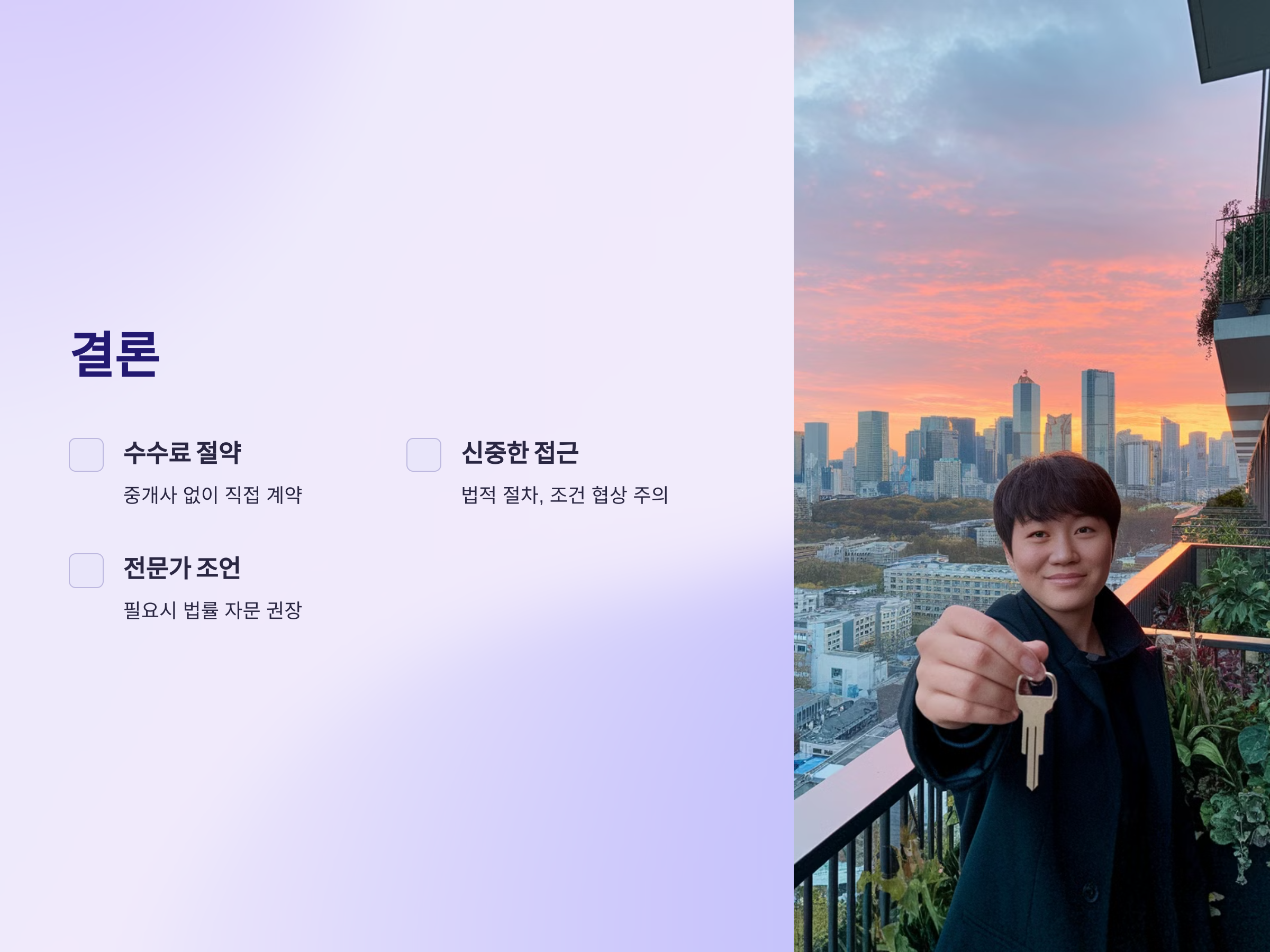 중개사 없이 월세 계약을 진행하는 방법은 점점 더 많은 사람들이 활용하고 있습니다. 이 방법을 잘 활용하면 금전적으로 유리할 수 있지만, 계약 전후의 절차를 철저히 준비하고, 법적 절차를 지키는 것이 중요합니다. 월세 계약을 준비하는 분들은 위의 절차를 참고하여 더 나은 조건의 계약을 체결하시길 바랍니다.