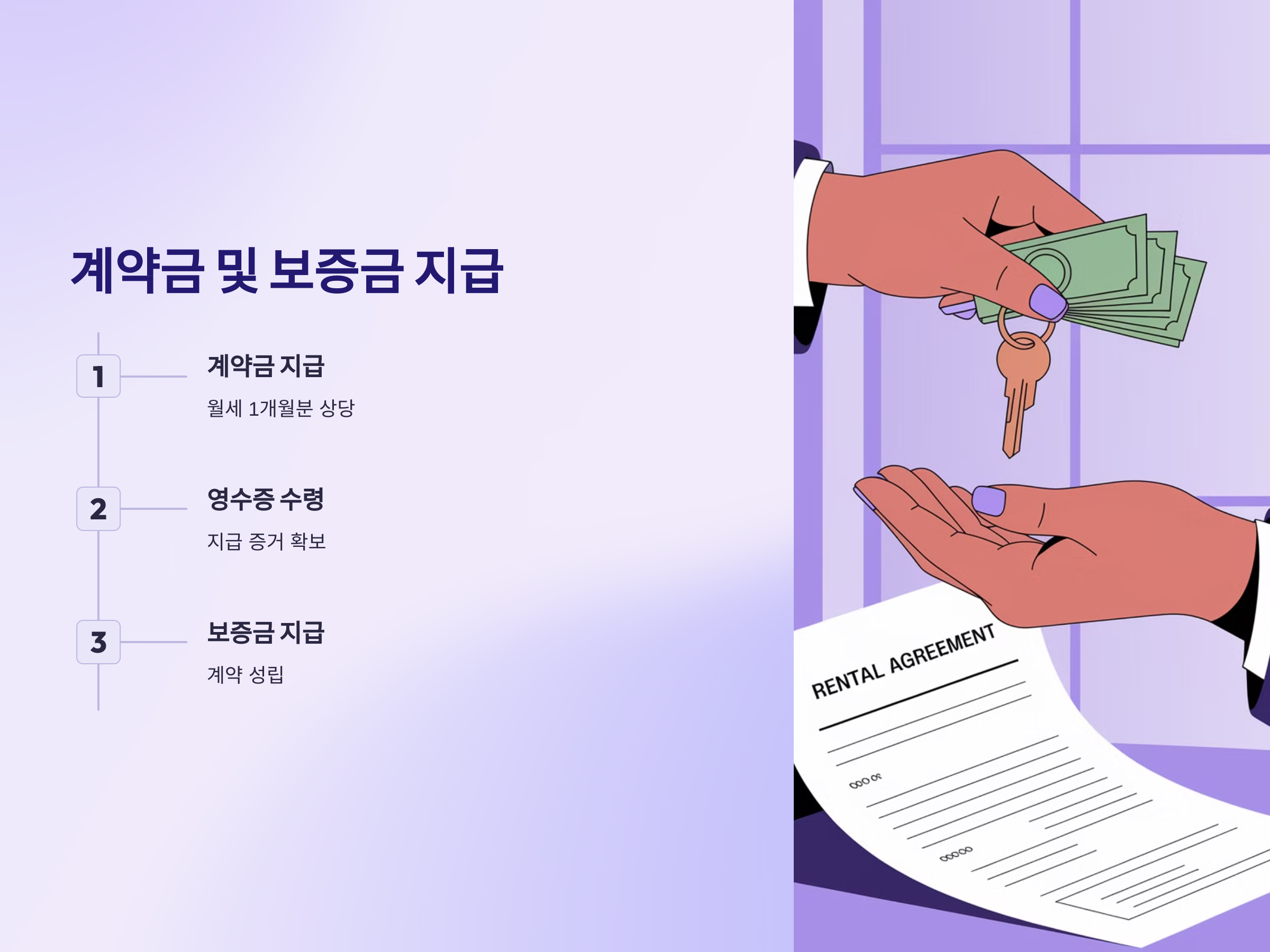계약서를 작성한 후, 계약금을 지급하고, 보증금을 집주인에게 전달하는 절차가 필요합니다. 계약금은 계약을 확정짓는 금액으로, 일반적으로 월세의 1개월분에 해당합니다. 이 계약금을 집주인에게 전달한 후, 보증금을 지급하면 월세 계약이 성립됩니다.