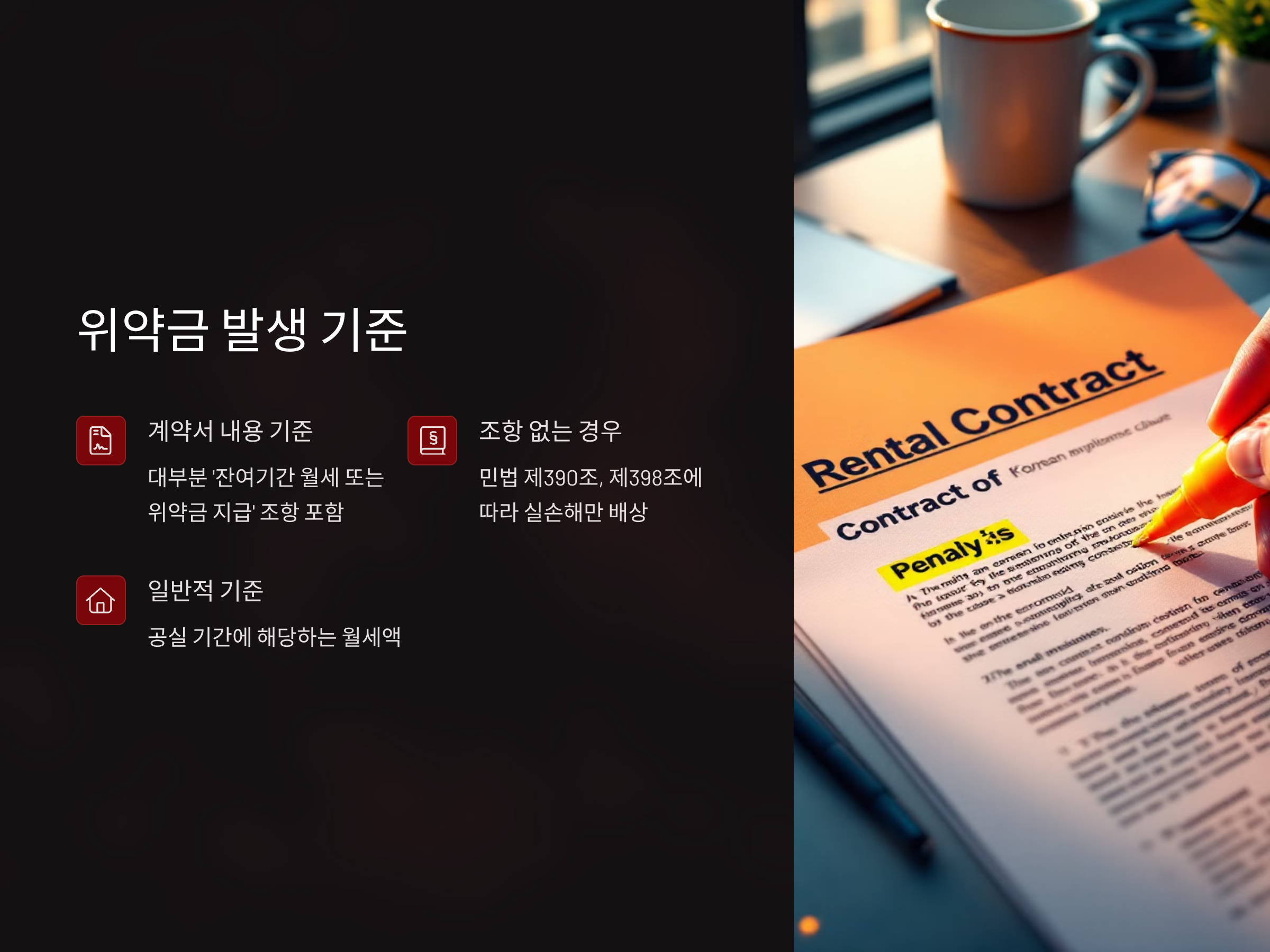 다만, 계약서에 명확한 위약금 조항이 없는 경우, 민법 제390조(채무불이행에 따른 손해배상) 및 제398조(위약금의 해석)에 따라 실손해만 배상하면 되며, 임대인이 입은 손해를 입증해야 합니다. 일반적으로는 잔여기간 동안의 월세 중 공실 기간에 해당하는 금액을 위약금으로 삼는 경우가 많습니다.