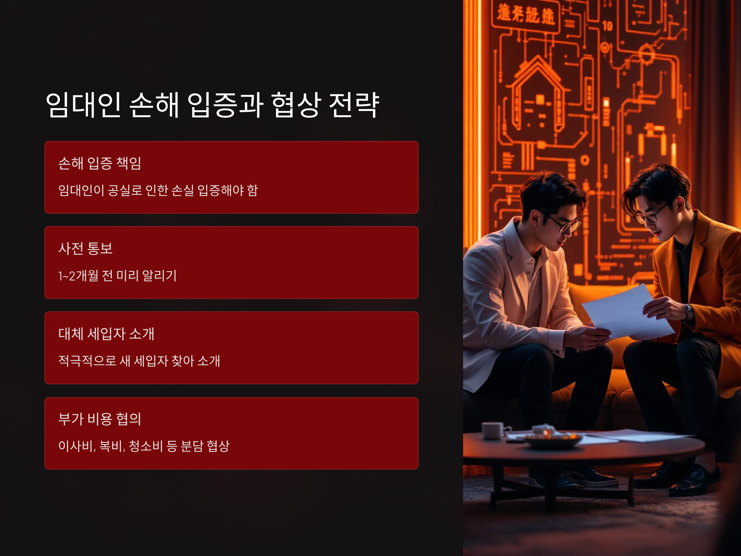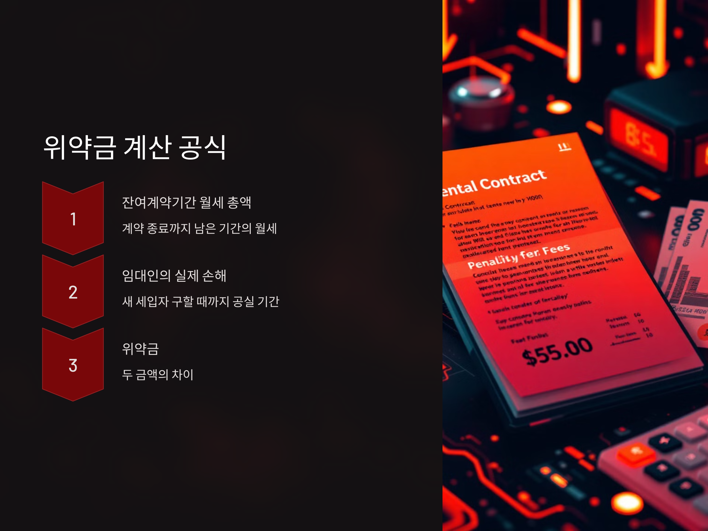 위약금 산정 시 중요한 점은 ‘임대인의 손해 입증 책임’입니다. 세입자가 해지하더라도, 임대인은 자신의 손해(즉, 공실로 인한 수익 손실)를 입증해야만 위약금을 청구할 수 있습니다. 이 점은 계약서상 조항이 없을 경우 매우 중요하게 작용합니다.