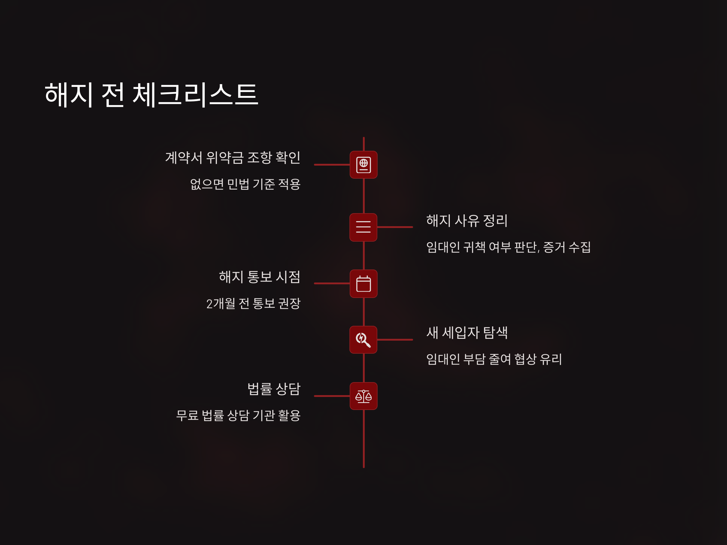 해지하려는 사유가 임대인의 귀책에 해당되는지 여부 판단 필요. 주거환경 하자, 계약 불이행 등 증거 수집 필수.