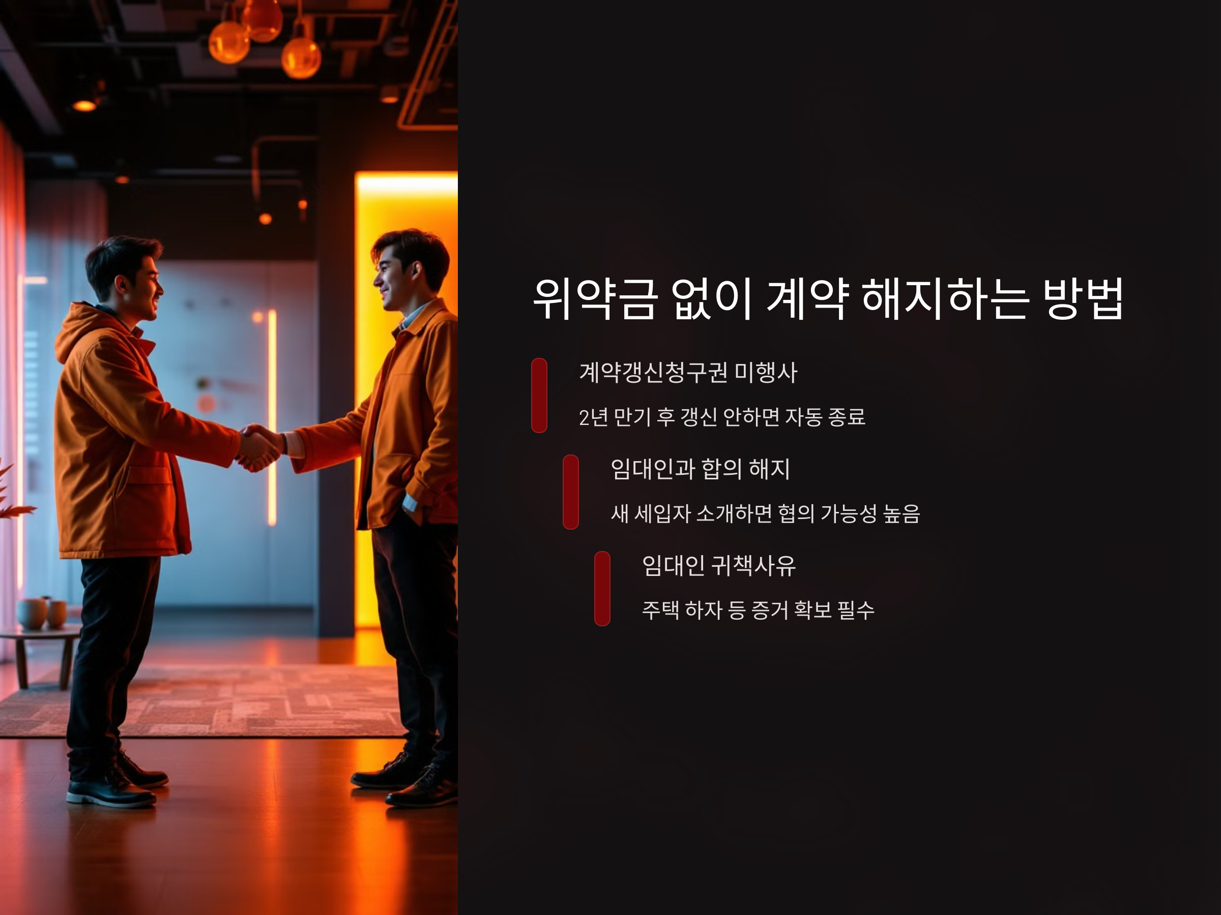 협상 전략으로는 계약 해지 통보를 1~2개월 이전에 미리 알리는 것이 효과적입니다. 임대인 입장에서도 새로운 세입자를 구할 시간이 생기고, 세입자가 능동적으로 대체 세입자를 찾아 소개하는 경우 협의는 훨씬 수월해집니다.