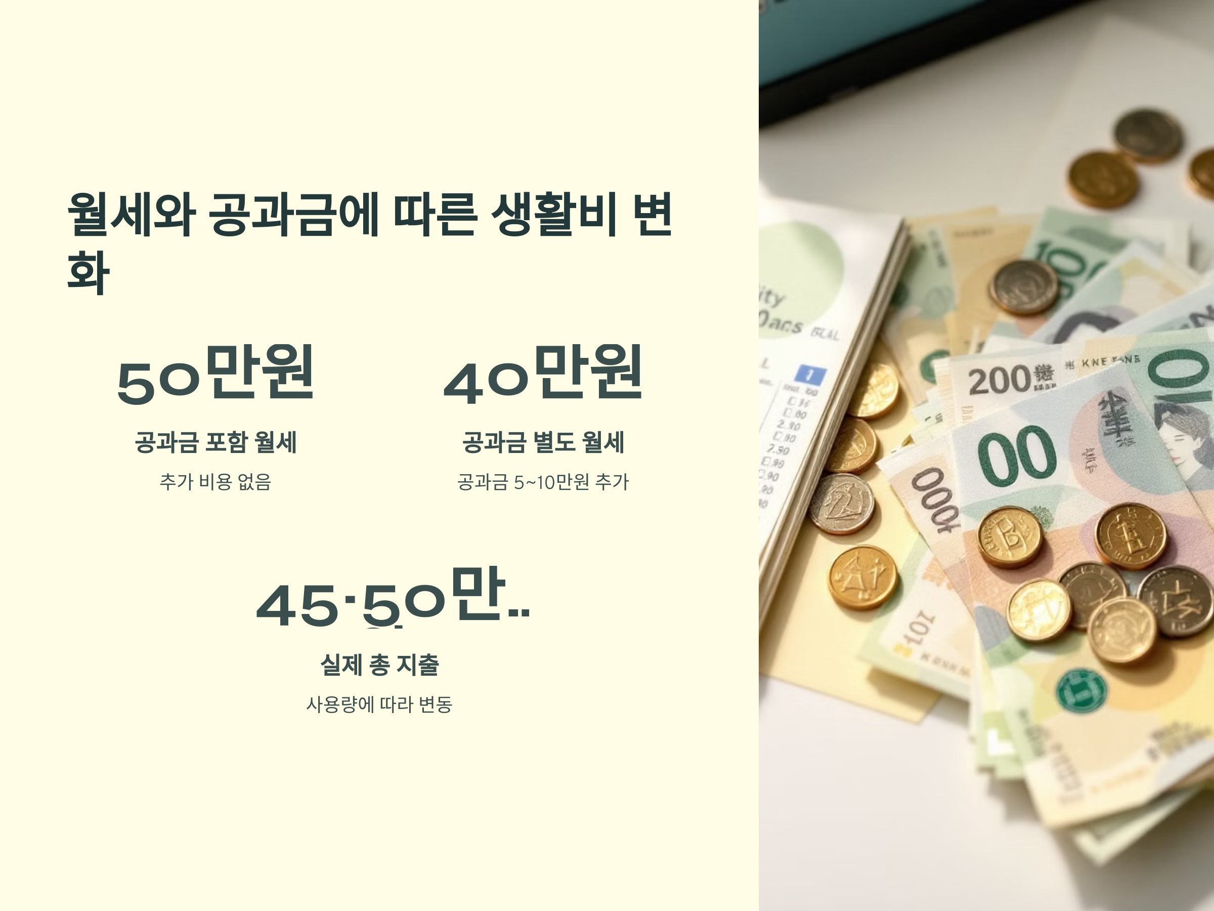 - 공과금 별도 월세: 월세 금액이 40만원이라면, 공과금이 5~10만원 추가될 수 있음