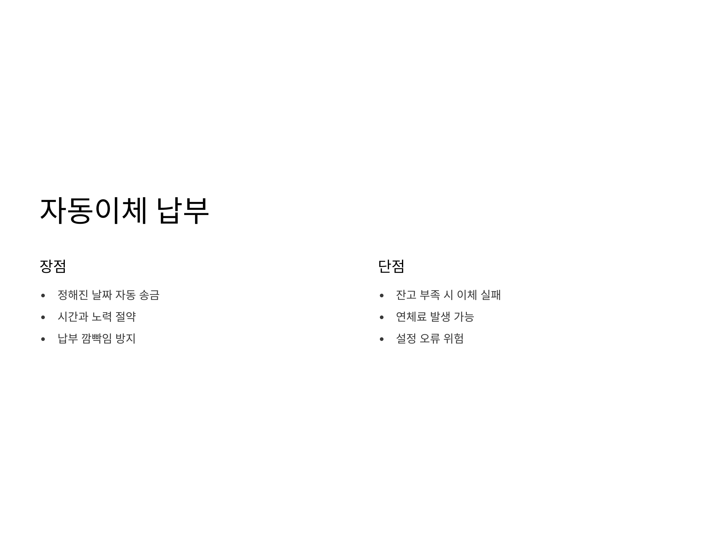 자동이체의 단점은 계좌에 잔고가 부족할 경우 이체가 실패할 수 있다는 점입니다. 이로 인해 연체료가 부과되거나 집주인과의 관계에 문제가 생길 수 있습니다. 또한, 자동이체 설정을 잘못하면 실수로 금액을 변경하는 일이 발생할 수 있습니다. 따라서 계좌 잔고를 주기적으로 확인하고, 이체 설정을 정확하게 해야 합니다.