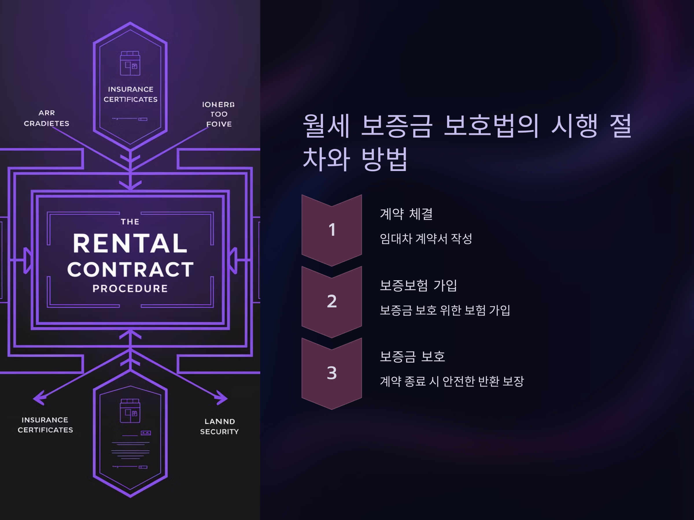 월세 보증금 보호법의 시행 절차는 보증금이 1천만 원 이상일 경우, 임대차 계약 시 보증보험에 가입하는 형태로 이루어집니다. 이는 임차인이 임대차 계약 종료 후 보증금을 안전하게 반환받을 수 있도록 보장하는 제도입니다. 보증보험은 계약 시 임대인이 임차인에게 보증금을 반환할 의무를 이행하지 않거나, 퇴거 후 보증금을 반환하지 않는 경우, 보증보험회사가 이를 대신 지급하게 됩니다.