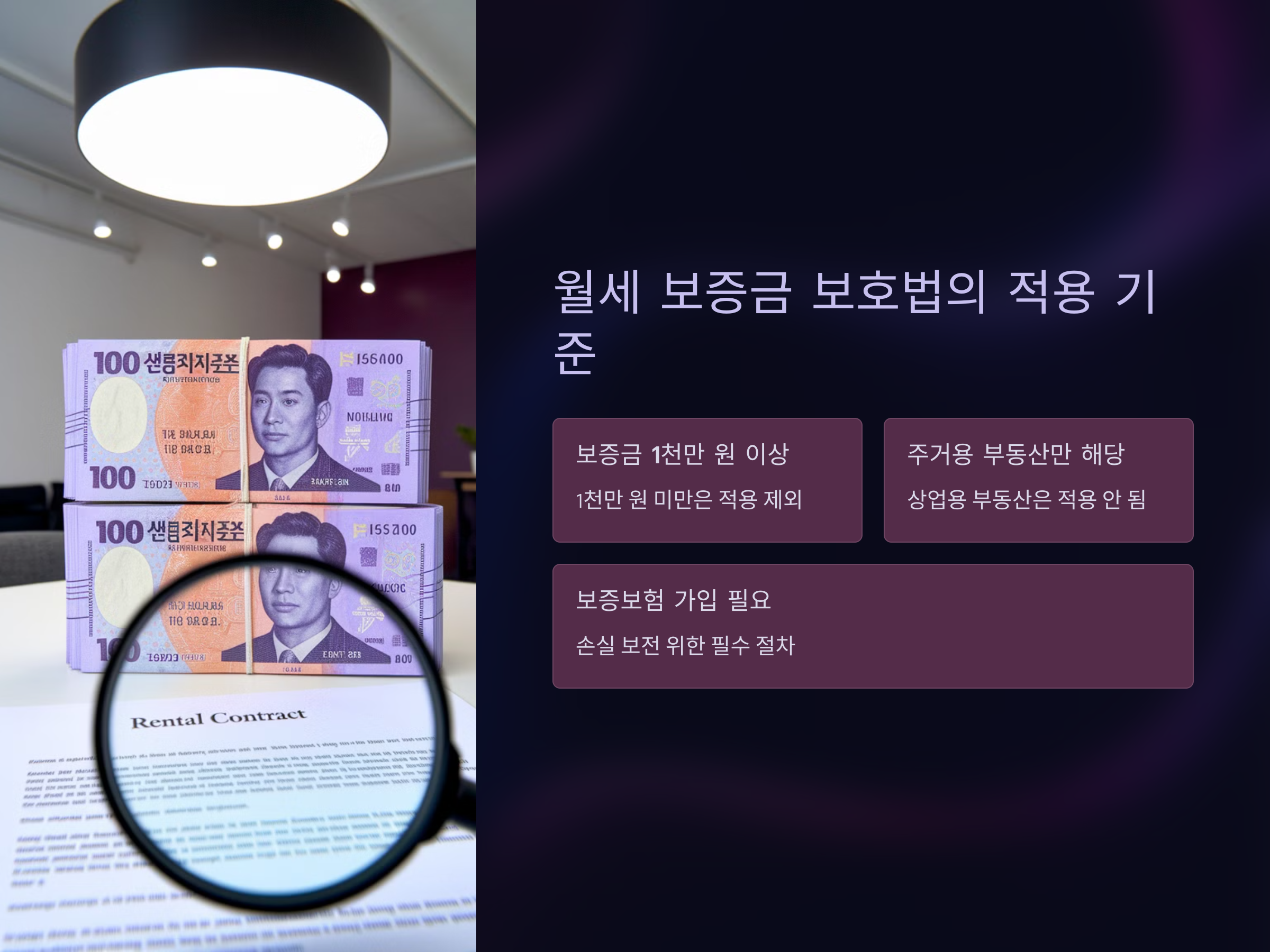 월세 보증금 보호법이 적용되기 위한 기준은 무엇일까요? 우선, 이 법은 월세 계약에서 보증금이 일정 금액을 초과할 때 적용됩니다. 한국에서는 보증금이 1천만 원 이상인 경우, 월세 보증금 보호법의 적용 대상이 됩니다. 만약 보증금이 1천만 원 이하라면, 이 법의 보호를 받지 않게 됩니다.