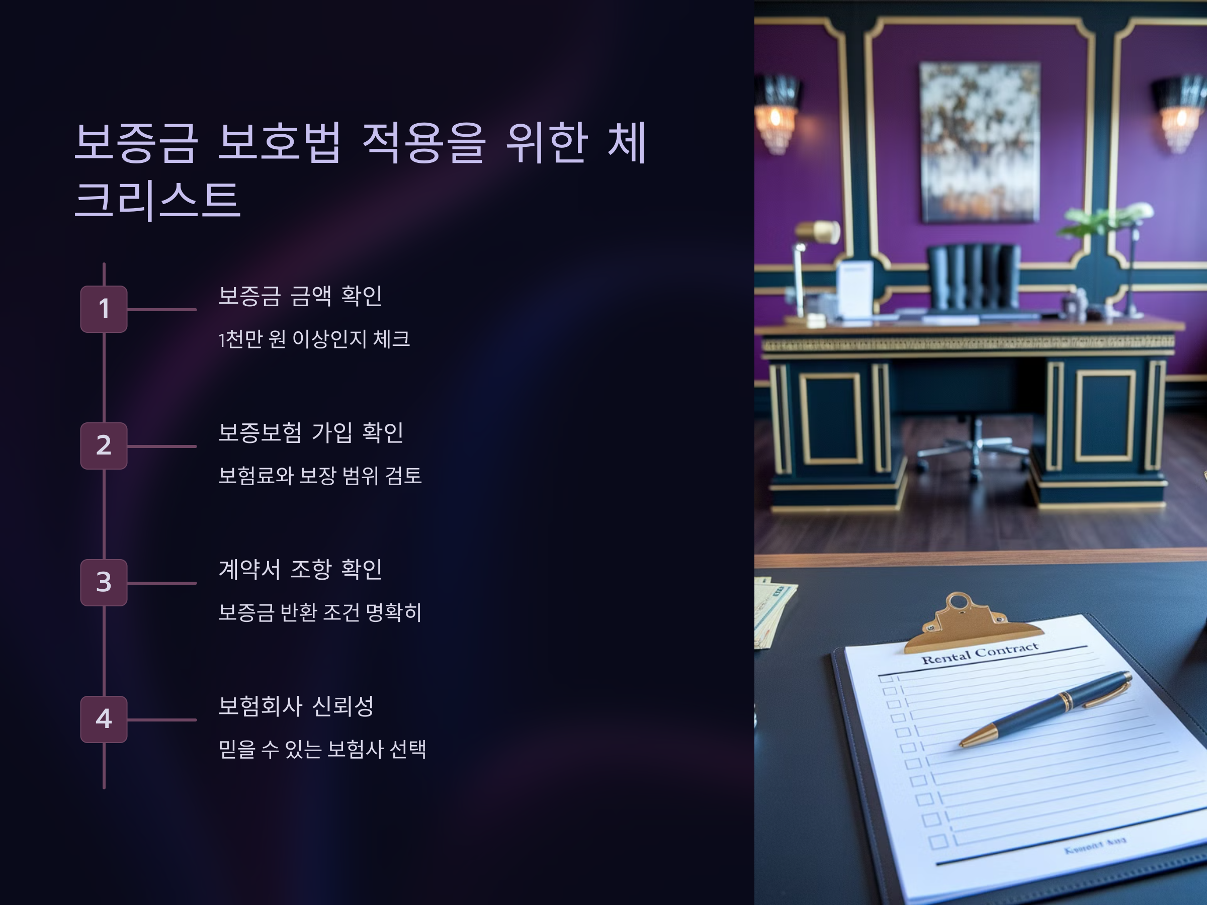 다음으로, 보증보험 가입 여부를 확인해야 합니다. 보증보험에 가입하지 않으면, 이 법의 보호를 받지 못할 수 있습니다. 계약서에 보증보험 관련 사항이 명시되어 있는지 확인하고, 보험료와 보증금 반환 절차 등을 미리 점검하는 것이 좋습니다. 또한, 보증보험 회사의 신뢰성도 반드시 확인해 두어야 합니다.