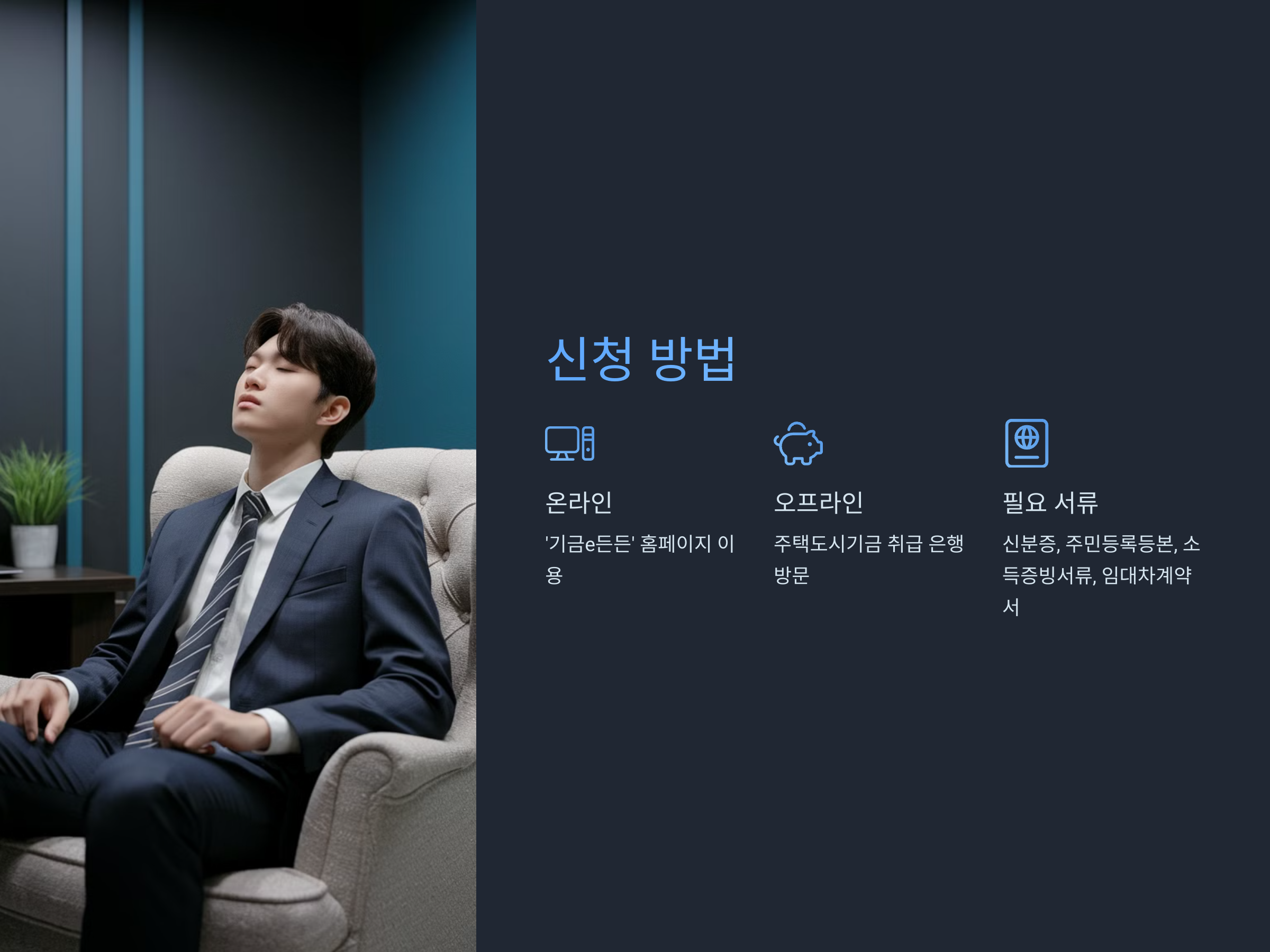 - 온라인 신청: 주택도시기금의 '기금e든든' 홈페이지를 통해 신청 가능합니다.