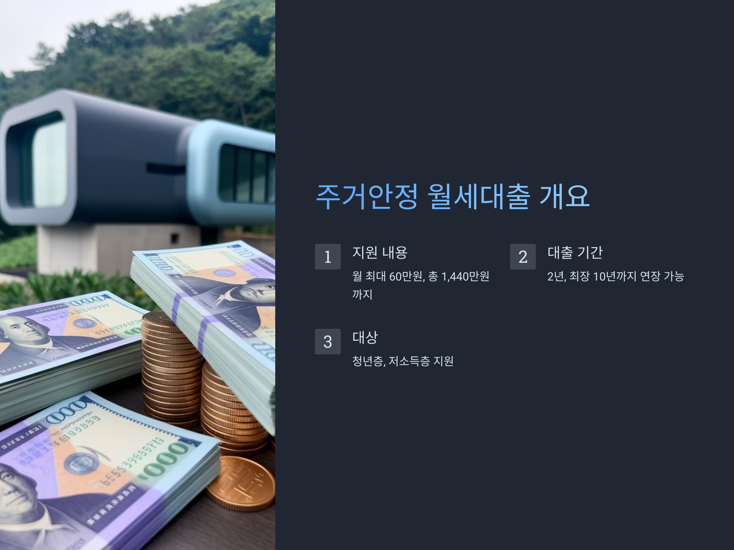 주거안정 월세대출은 월세 부담으로 어려움을 겪는 청년층과 저소득층에게 큰 도움이 되는 제도입니다. 자격 요건과 신청 방법을 꼼꼼히 확인하시고, 안정적인 주거 생활을 위해 적극적으로 활용해 보시기 바랍니다.