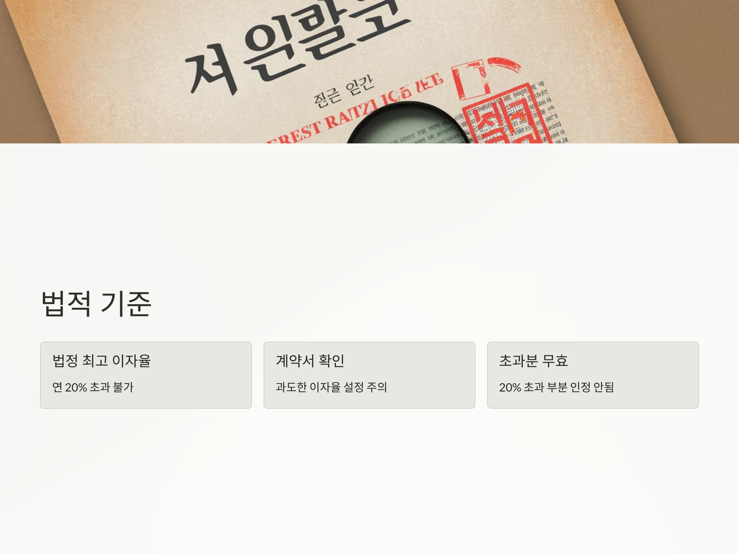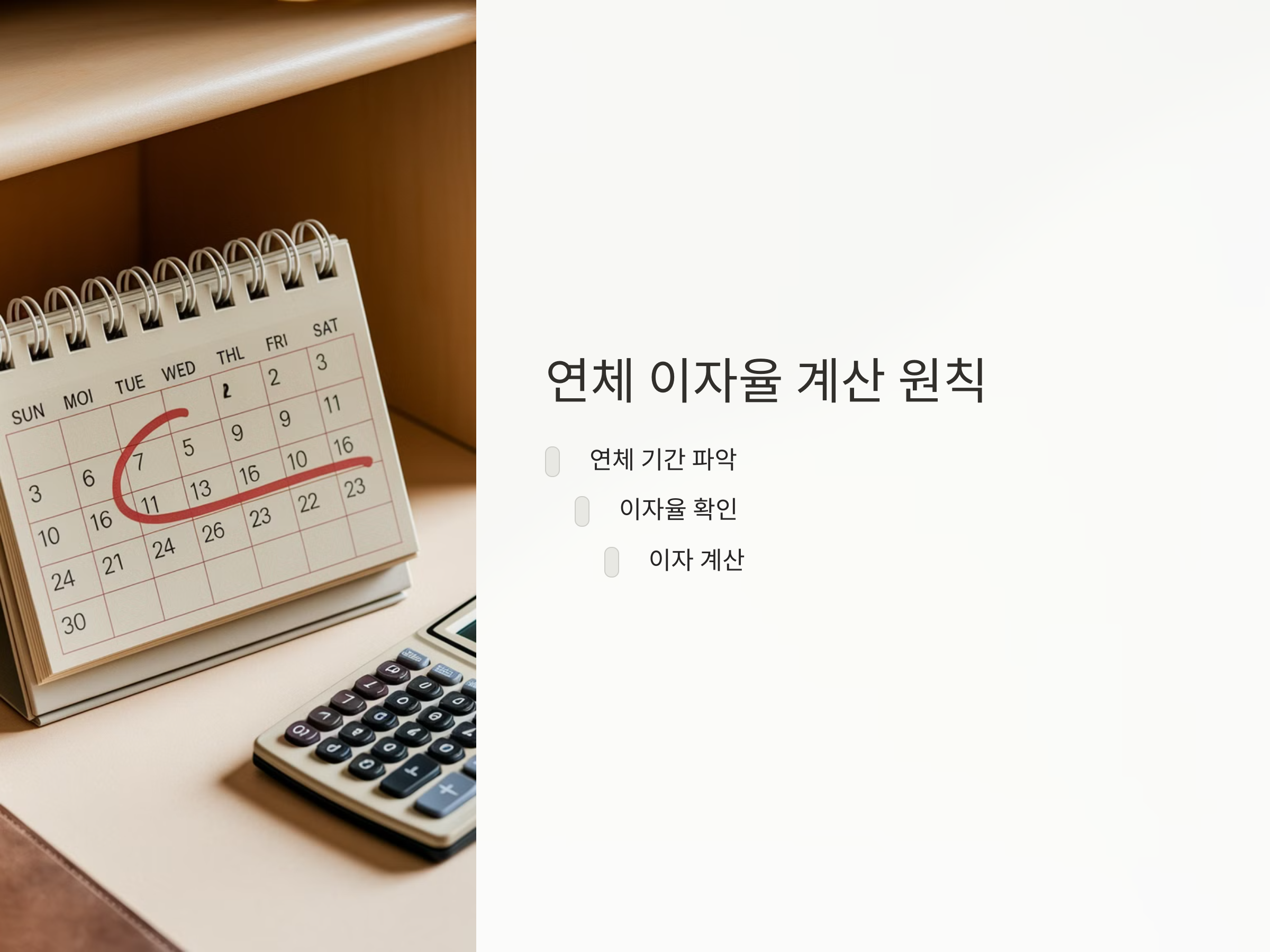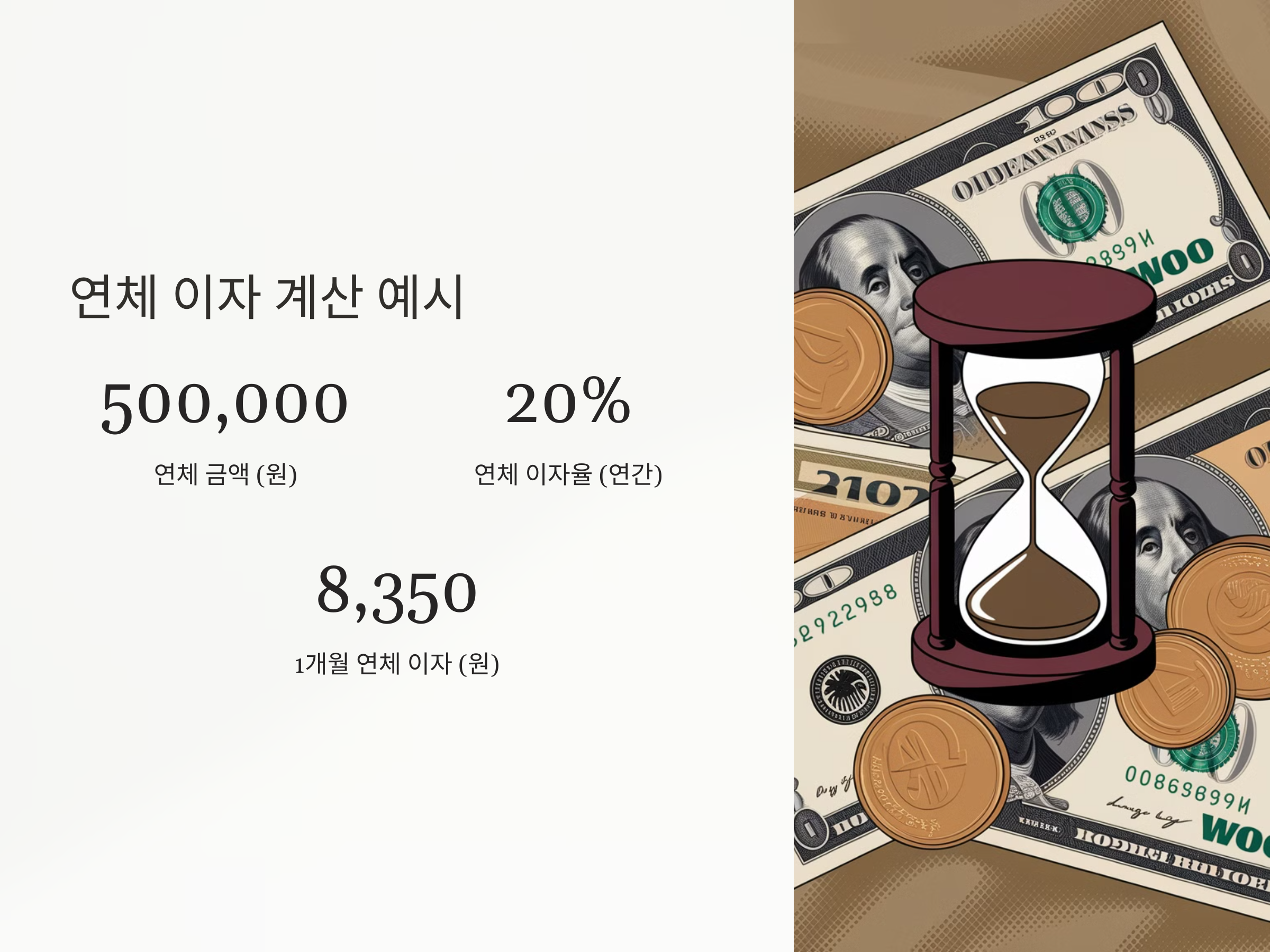 - 이자율 확인: 계약서나 법정 이자율을 참고하여 연체 이자율을 확인합니다. 보통 연체 이자율은 연 20%에서 25% 사이로 설정됩니다.