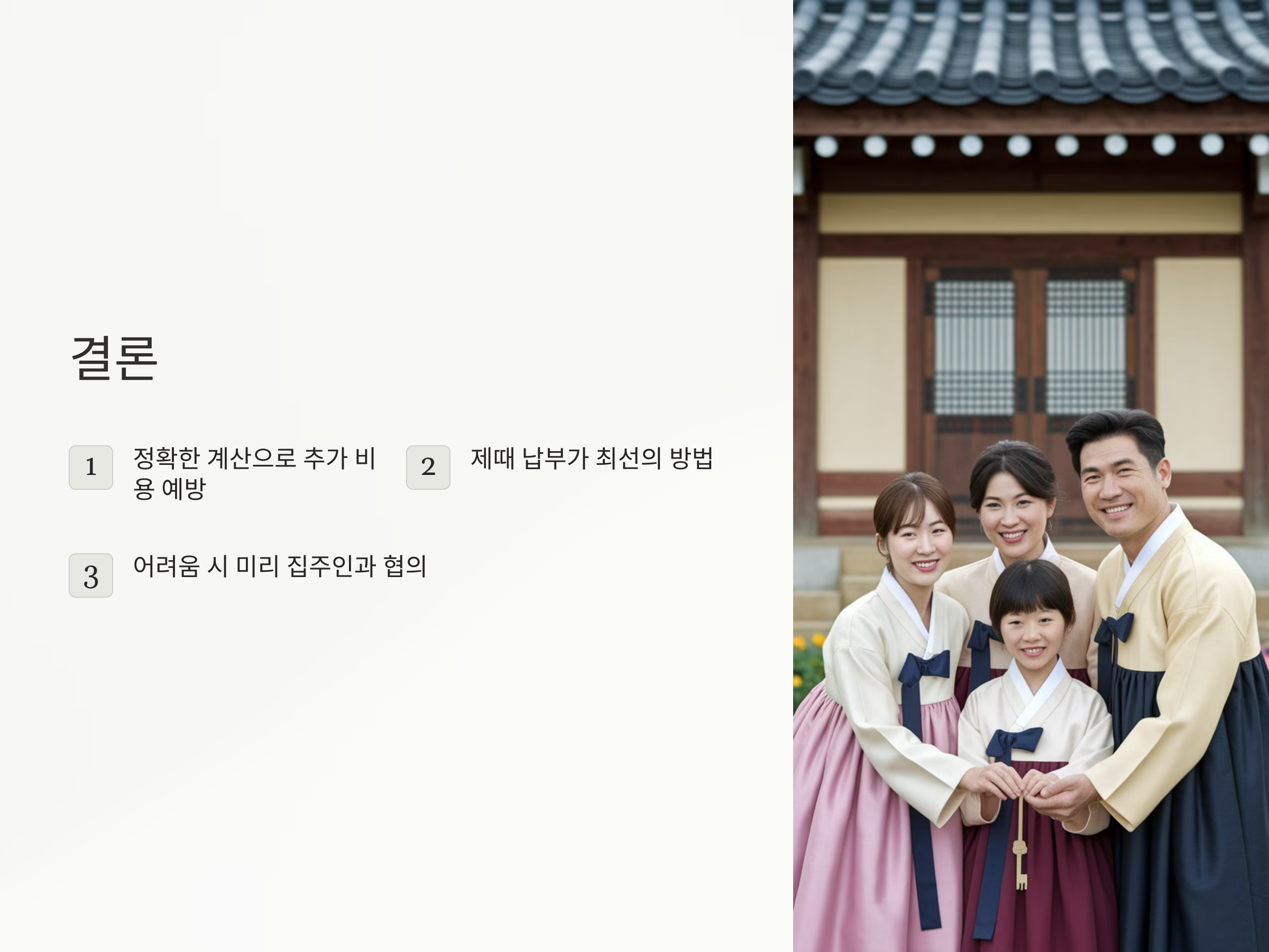 - 기한 내 납부: 연체가 길어지면 이자뿐만 아니라 계약 해지, 강제 퇴거 등의 법적 문제가 발생할 수 있습니다. 가능한 한 빠르게 해결하는 것이 좋습니다.
