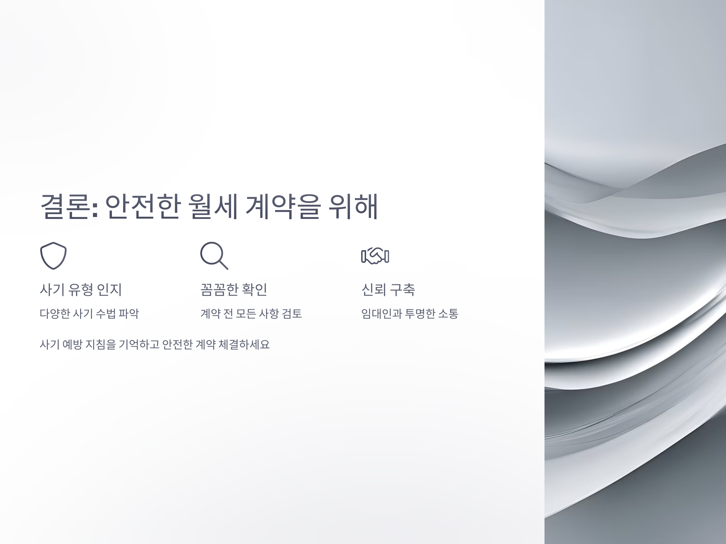월세 계약에서 발생할 수 있는 다양한 사기 유형에 대해 살펴보았습니다. 월세 계약을 진행할 때는 각종 사기 유형을 미리 알고 예방하는 것이 가장 중요합니다. 사기를 예방하는 가장 좋은 방법은 임대인과의 계약 조건을 명확히 하고, 신뢰할 수 있는 부동산 중개업체를 선택하는 것입니다. 또한, 계약 전후의 모든 문서를 꼼꼼히 확인하고, 계약금이나 보증금을 미리 지급하는 경우, 반드시 영수증을 챙기고 확인하는 절차를 거쳐야 합니다.