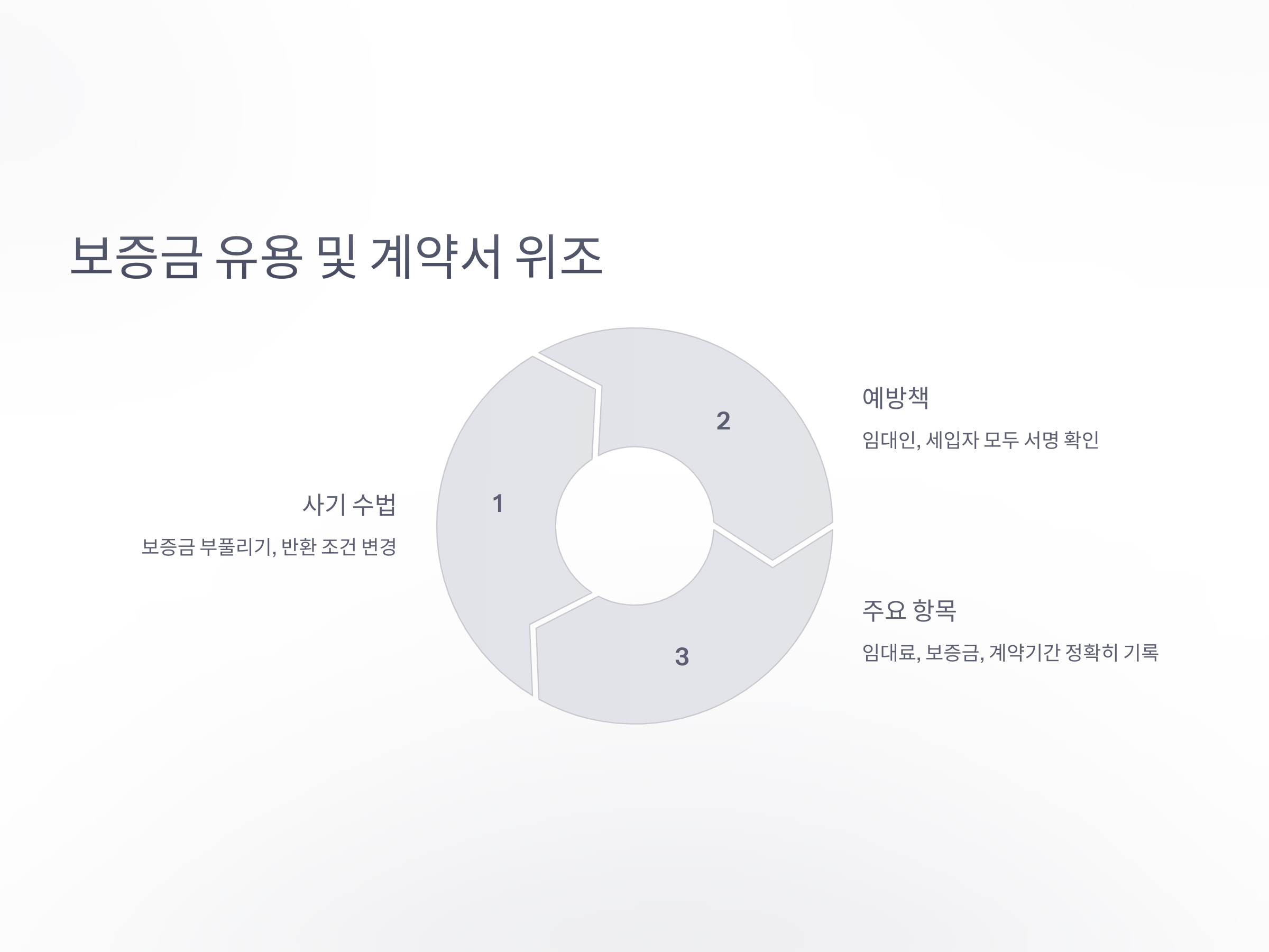 보증금을 유용하거나 계약서를 위조하는 사기 역시 많이 발생하는 문제입니다. 특히, 계약서를 위조하여 보증금을 부풀리거나, 보증금에 대한 반환 조건을 바꾸는 등의 사기가 있을 수 있습니다. 보증금이 제대로 반환되지 않는 문제는 임차인에게 큰 피해를 주기 때문에, 이 부분에서 신중을 기해야 합니다.