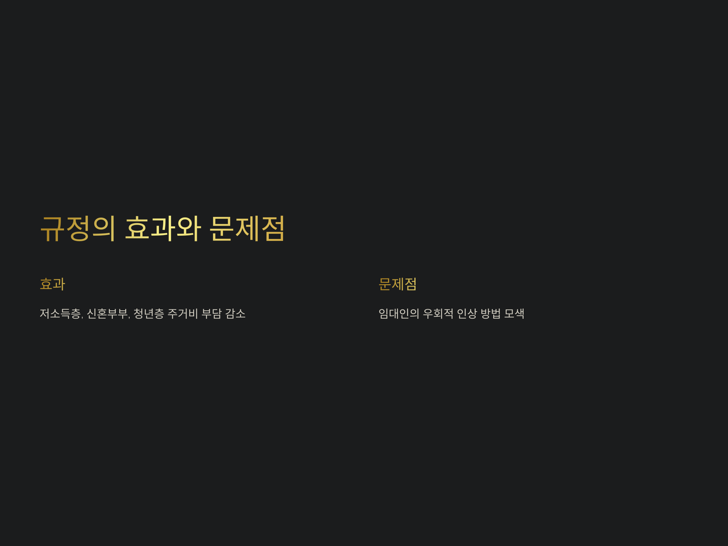 월세 인상률 제한 규정의 가장 큰 효과는 세입자들의 주거비 부담을 덜어주는 것입니다. 특히, 저소득층과 신혼부부, 청년층에게 큰 도움이 될 수 있습니다. 하지만, 이 규정에는 몇 가지 문제점도 존재합니다. 우선, 인상률 제한으로 인해 일부 임대인들이 월세 인상을 제대로 반영하지 못하거나, 계약 조건을 변경할 수 있는 우회적인 방법을 선택할 위험이 존재합니다. 또한, 일부 임대인들이 월세를 인상할 수 없는 상황에서 대신 관리비나 기타 부대비용을 늘려서 세입자의 부담을 증가시키는 경우도 있을 수 있습니다.