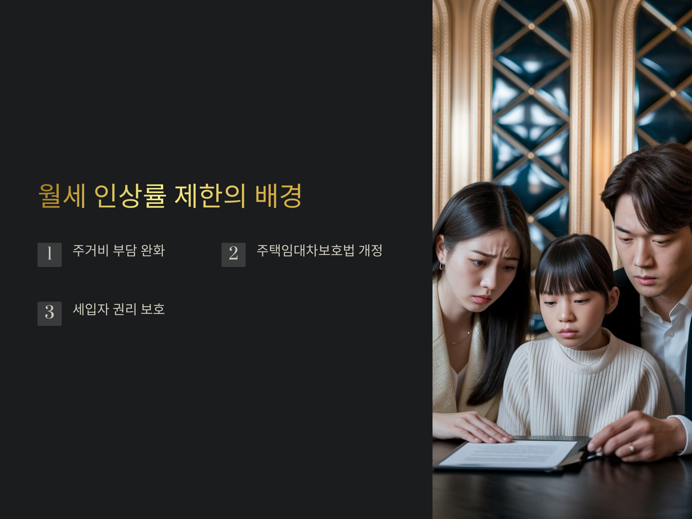 월세 인상률 제한 규정이 등장한 배경은 주거비 부담을 덜어주기 위한 노력의 일환입니다. 정부는 특히 서민들의 주거비 부담을 덜어주기 위해 '주택임대차보호법' 개정안을 통해 월세 인상률을 제한하는 법적 근거를 마련했습니다. 이에 따라, 일정 기간 동안의 월세 인상률을 제한하고 있으며, 그 한도를 법으로 규정하여 세입자들의 권리를 보호하고 있습니다. 또한, 고물가 시대가 지속되면서 월세를 무분별하게 인상하는 것을 방지하기 위해 월세 인상률을 법적으로 제한하고 있는 것이죠.