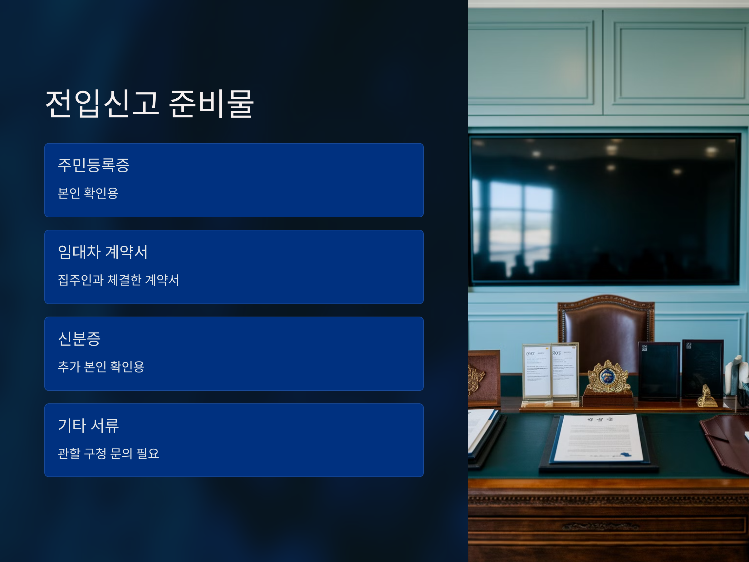 이 서류들을 준비한 후, 관할 구청의 주민센터에 방문하거나 온라인으로 전입신고를 진행하면 됩니다. 절차 자체는 간단하고 빠르지만, 반드시 계약 후 빠르게 진행하는 것이 중요합니다.