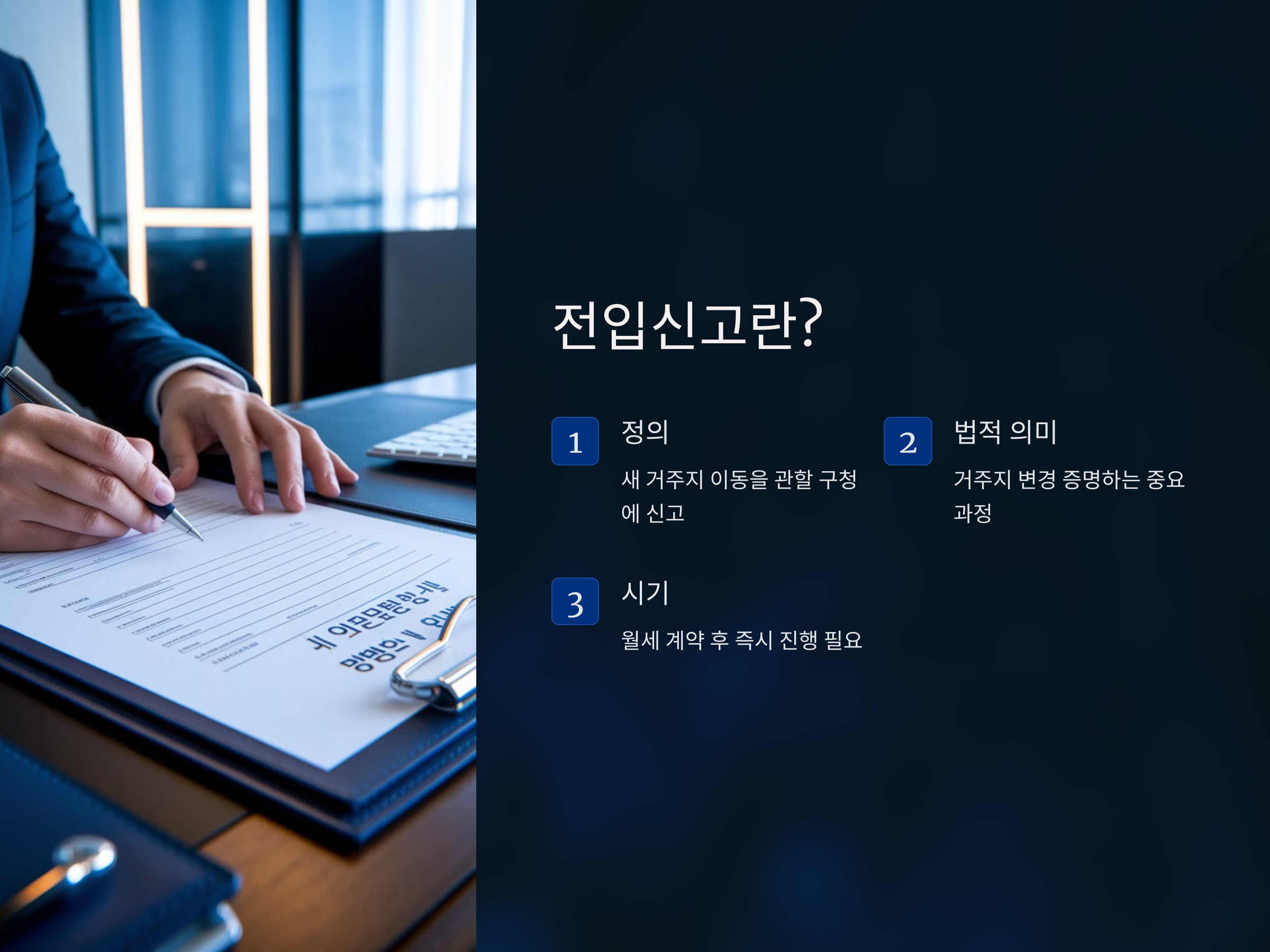 전입신고는 세입자가 새로운 거주지로 이동하여 그 주소지에 거주할 것임을 관할 구청에 신고하는 절차를 말합니다. 이는 단순히 주소지를 변경하는 행위가 아니라, 법적으로도 거주지를 변경했다는 것을 증명하는 중요한 과정입니다. 특히, 전입신고를 하지 않으면 주민등록상 주소지가 변경되지 않기 때문에 여러 가지 불편함을 겪을 수 있습니다.