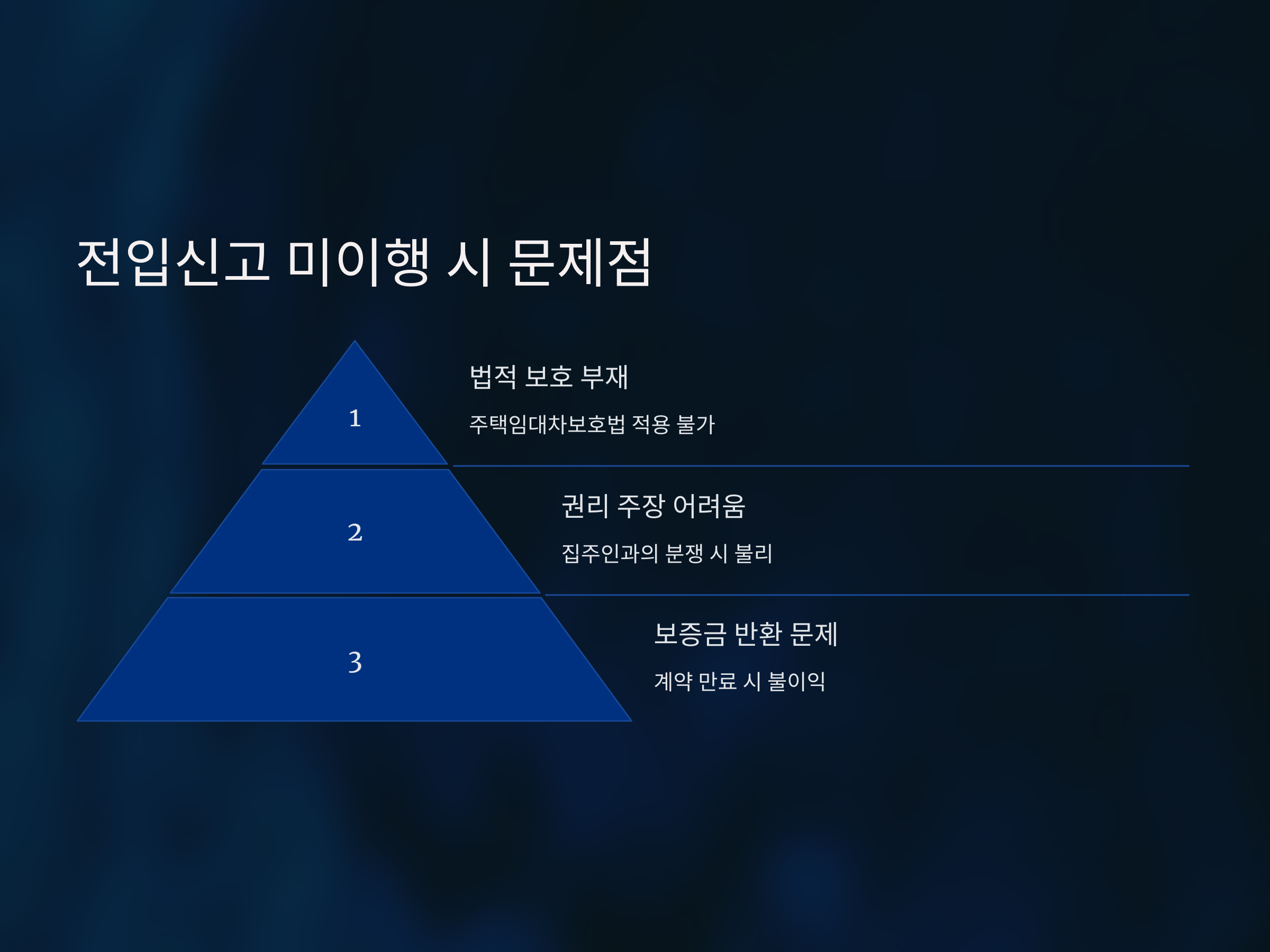 전입신고를 하지 않으면 주택임대차보호법의 적용을 받지 못할 수 있으며, 보증금 반환이나 계약 해지 시 불이익을 겪을 수 있습니다.