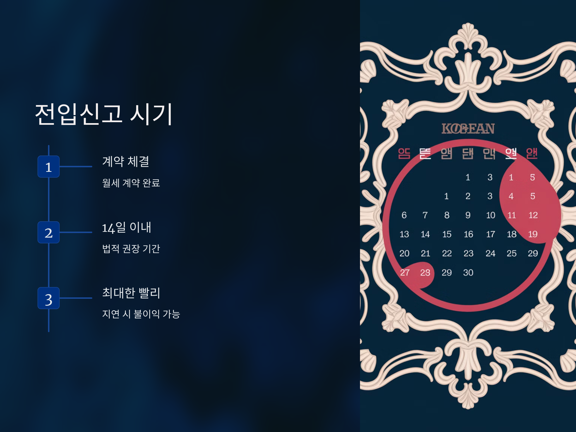 월세 전입신고는 계약을 체결한 후 최대한 빨리 해야 합니다. 법적으로는 계약서 작성일로부터 14일 이내에 전입신고를 하는 것이 권장됩니다. 만약 계약 후 전입신고를 미루게 되면, 해당 거주지가 법적으로 인정되지 않거나 나중에 신고를 하지 않았다는 이유로 문제가 발생할 수 있습니다.