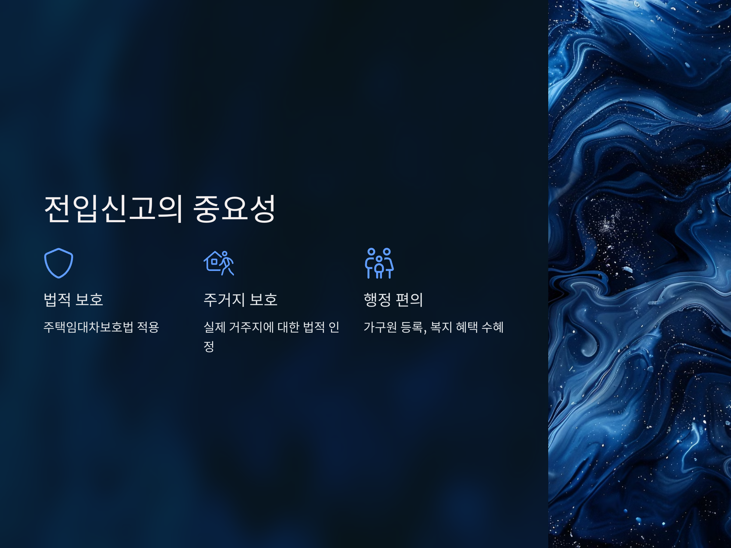 - 가족 구성원이 있거나, 관련된 행정 절차(예: 아동학비 지원, 공공 복지 혜택 등)를 진행할 때, 전입신고가 완료되어 있어야 원활한 처리가 가능합니다.