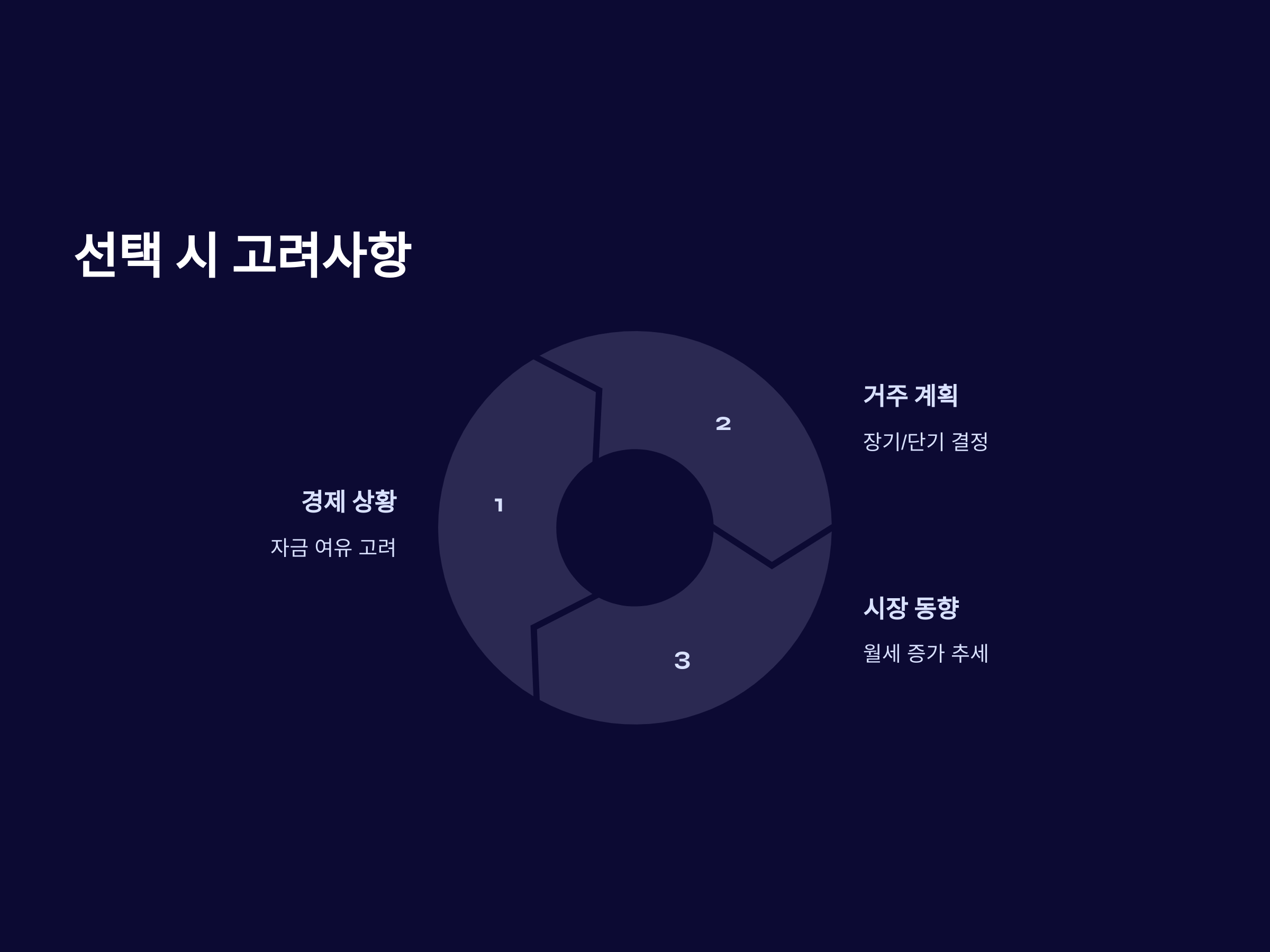 - 장기적인 계획: 만약 2년 이상의 안정적인 거주가 필요하다면 전세가 더 유리할 수 있습니다. 그러나 자주 이사를 고려하거나 계약 기간에 유연성이 필요한 경우 월세가 더 나은 선택이 될 수 있습니다.